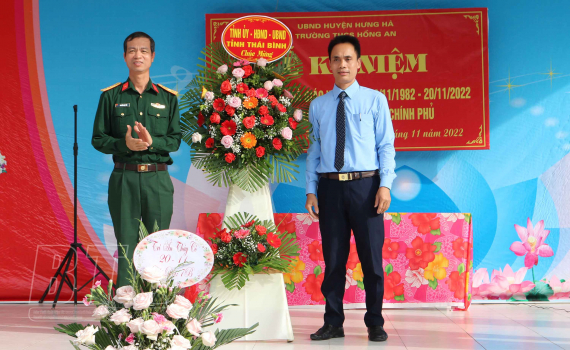 Đồng chí Chỉ huy trưởng Bộ CHQS tỉnh đã tặng hoa và gửi những lời chúc mừng tốt đẹp nhất đến đội ngũ cán bộ, giáo viên Trường THCS Hồng An nhân ngày Nhà giáo Việt Nam 20/11. Đồng chí ghi nhận và đánh giá cao những nỗ lực, cố gắng cùng đóng góp to lớn của nhà trường, góp phần vào công tác giáo dục và đào tạo của huyện và tỉnh; đồng thời đề nghị nhà trường phát huy hơn nữa tinh thần đoàn kết, sáng tạo, chủ động nâng cao năng lực, trình độ chuyên môn, xây dựng môi trường giáo dục lành mạnh, tập trung triển khai đồng bộ các giải pháp nâng cao chất lượng giáo dục toàn diện, tích cực đổi mới phương pháp dạy và học, tiếp tục đầu tư, khai thác, sử dụng có hiệu quả cơ sở vật chất, trang thiết bị dạy học; địa phương tiếp tục quan tâm hơn nữa tới đầu tư cơ sở vật chất, đội ngũ cán bộ giáo viên đủ về số lượng, nâng cao về chất lượng, đáp ứng nhu cầu đào tạo học sinh thành những công dân đủ đức và tài có ích cho xã hội trong thời đại mới.