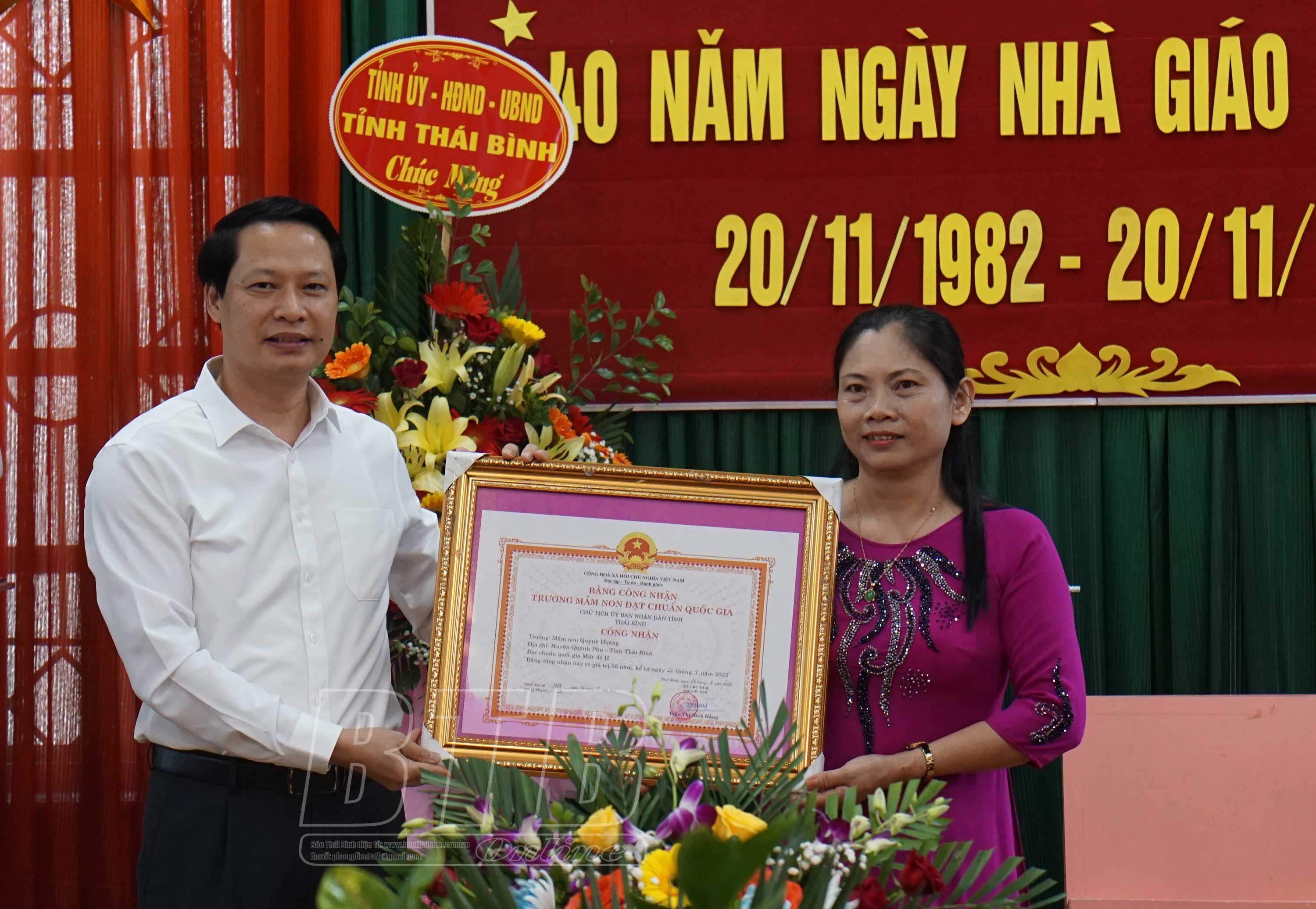 Đồng chí Hoàng Thái Phúc, Ủy viên Ban Thường vụ, Trưởng ban Nội chính Tỉnh ủy trao bằng công nhận Trường Mầm non đạt chuẩn Quốc gia mức độ II cho Trường Mầm non Quỳnh Hoàng.