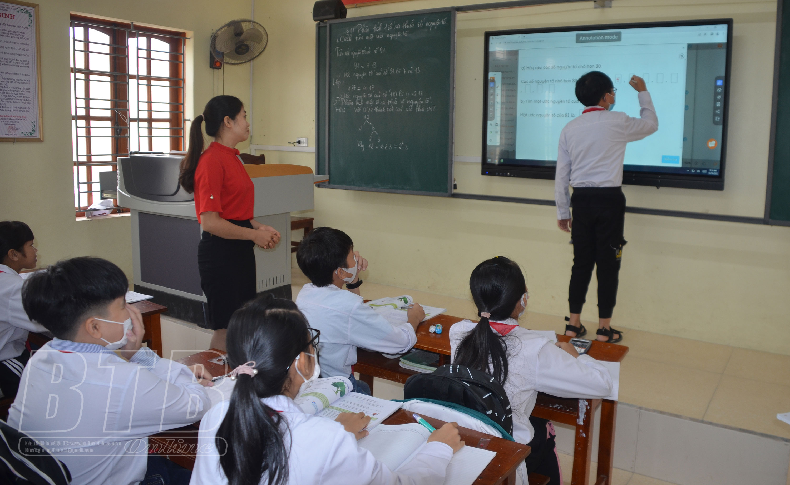 Còn tại giờ học Toán lớp 6, cô và trò cũng rất hứng thú với phương pháp mới. Cô giáo Phạm Thị Phương cho biết: So với phương pháp giảng dạy truyền thống trước đây là dùng bằng bảng đen và phấn trắng, giờ được đồng bộ các thiết bị hiện đại giúp chúng tôi thuận lợi hơn rất nhiều trong quá trình giảng dạy. Các thầy cô có thể trình chiếu bài giảng, ngoài ra còn cho các em thấy được các hình ảnh thực tế, ứng dụng vào bài học thực tế mà các em được học. Các em có thể tiếp cận được với nhiều thiết bị hiện đại để có cảm giác hứng thú học hơn, yêu thích môn học hơn. Tuy nhiên, để khai thác triệt để các thiết bị, mỗi cán bộ, giáo viên cũng phải thường xuyên tìm tòi bài giảng và tư liệu trên mạng, qua đó phục vụ cho việc giảng dạy tốt hơn.