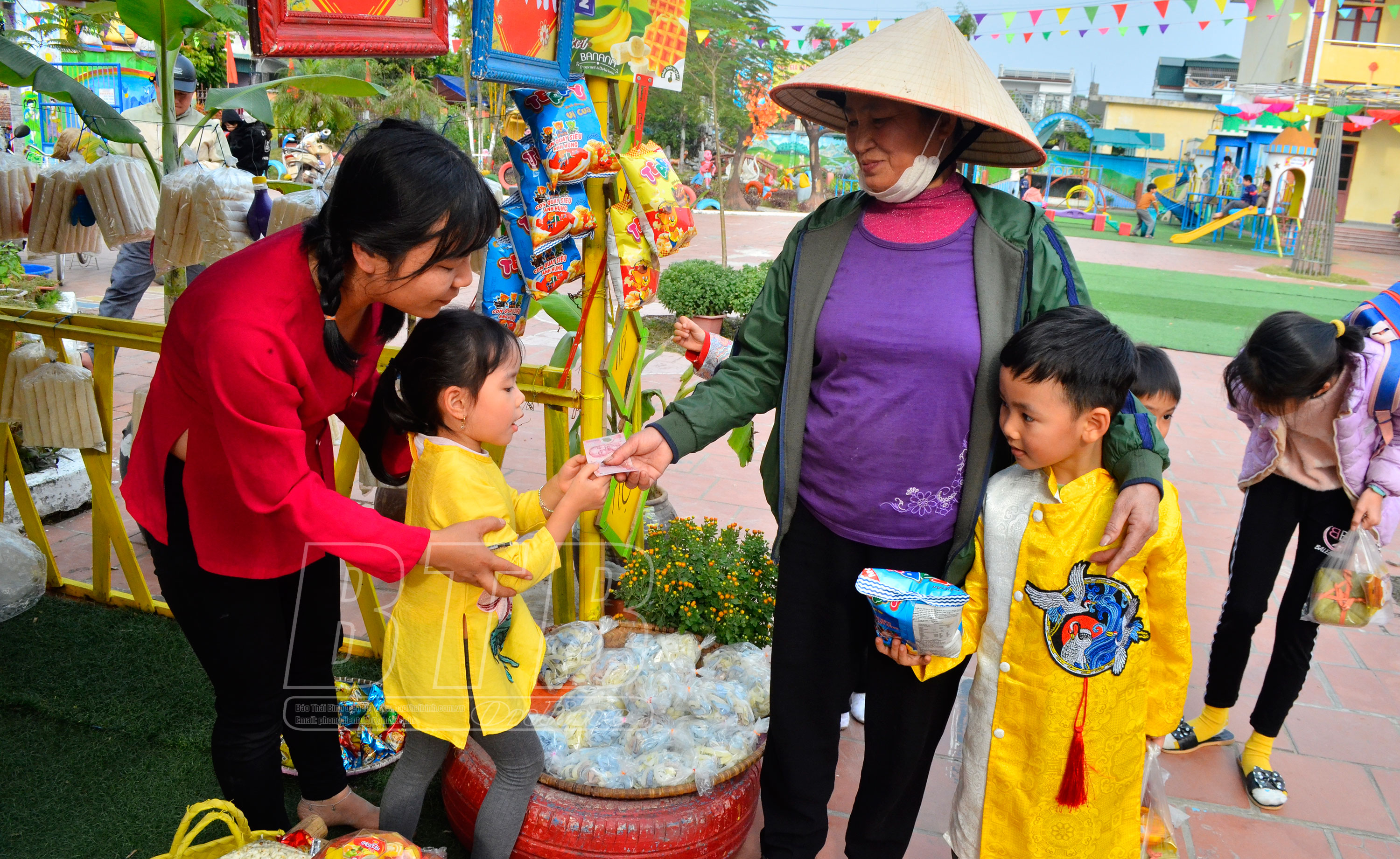 Các bé trải nghiệm tại các gian chợ quê.