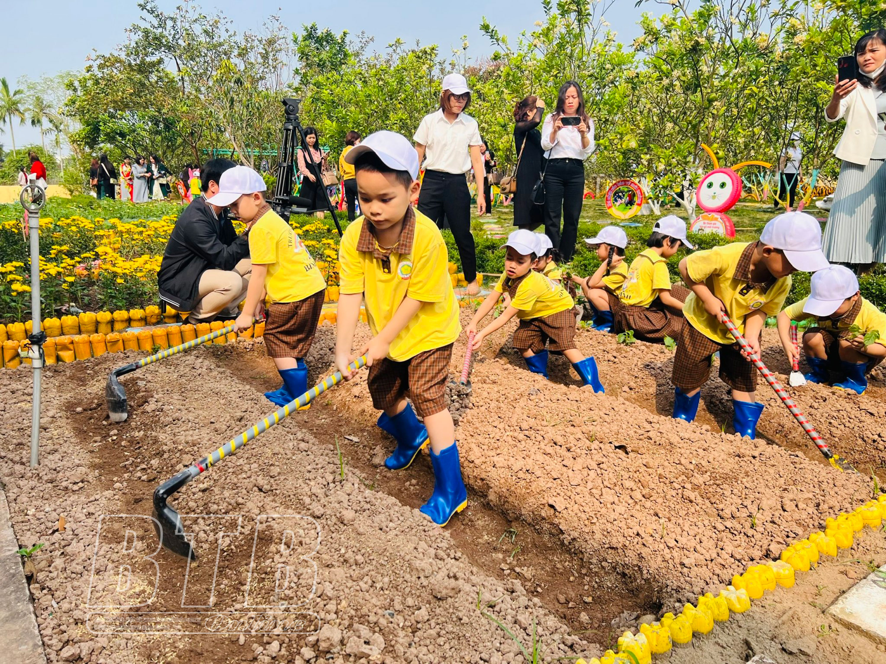 Trước đó, các đại biểu đã xem tiểu phẩm “Bé với biến đổi khí hậu và bảo vệ môi trường” do cô và trò Trường Mầm non Bình Định dàn dựng và biểu diễn; tham gia dự giờ các hoạt động tại một số lớp học gồm: giáo dục phát triển nhận thức, giáo dục phát triển ngôn ngữ; tham gia các hoạt động trải nghiệm ngoài trời như đá bóng, trồng và chăm sóc vườn rau, nhặt lá cây, phân loại rác, làm các sản phẩm tạo hình từ lá cây.