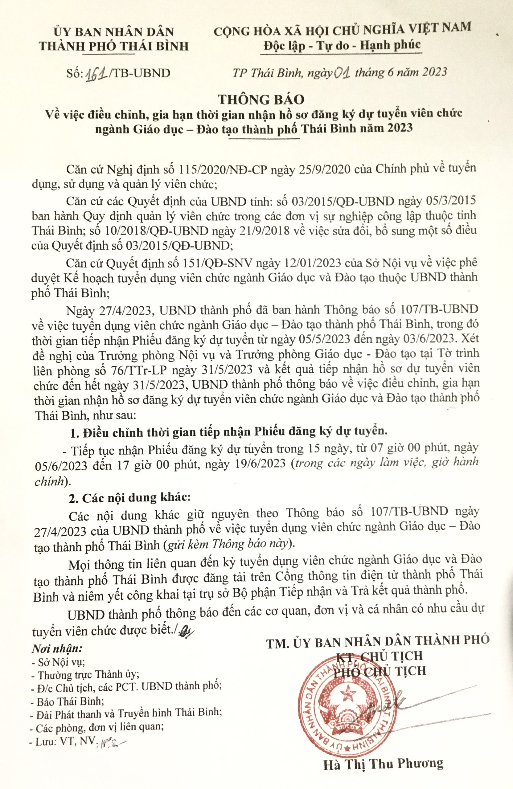 Thành phố Thái Bình: Điều chỉnh, gia hạn thời gian nhận hồ sơ đăng ký dự tuyển viên chức ngành giáo dục - đào tạo đến ngày 19/6/2023