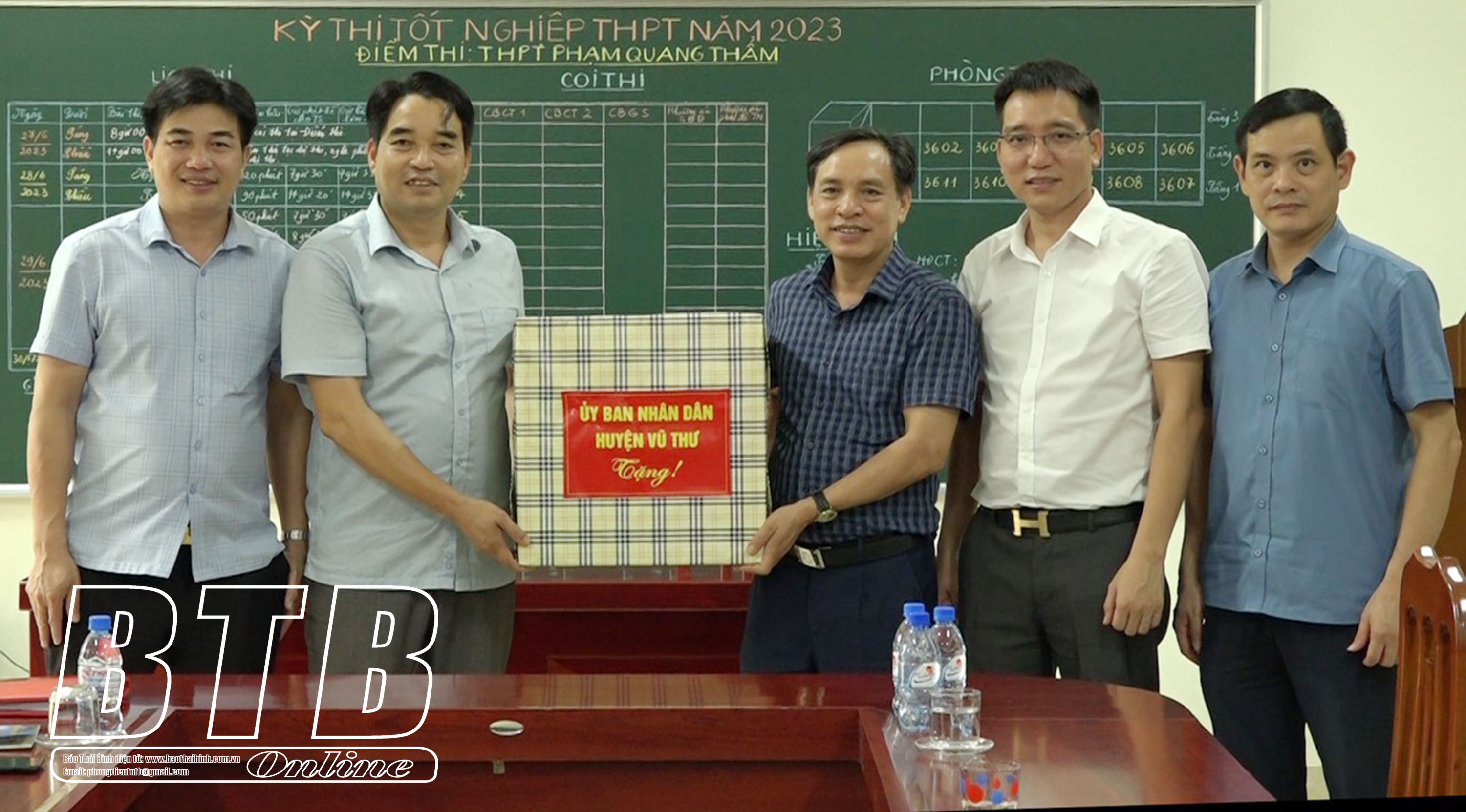 Lãnh đạo UBND huyện, Ban Chỉ đạo kỳ thi tốt nghiệp THPT năm 2023 huyện Vũ Thư tặng quà cán bộ coi thi tại điểm thi Trường THPT Phạm Quang Thẩm.