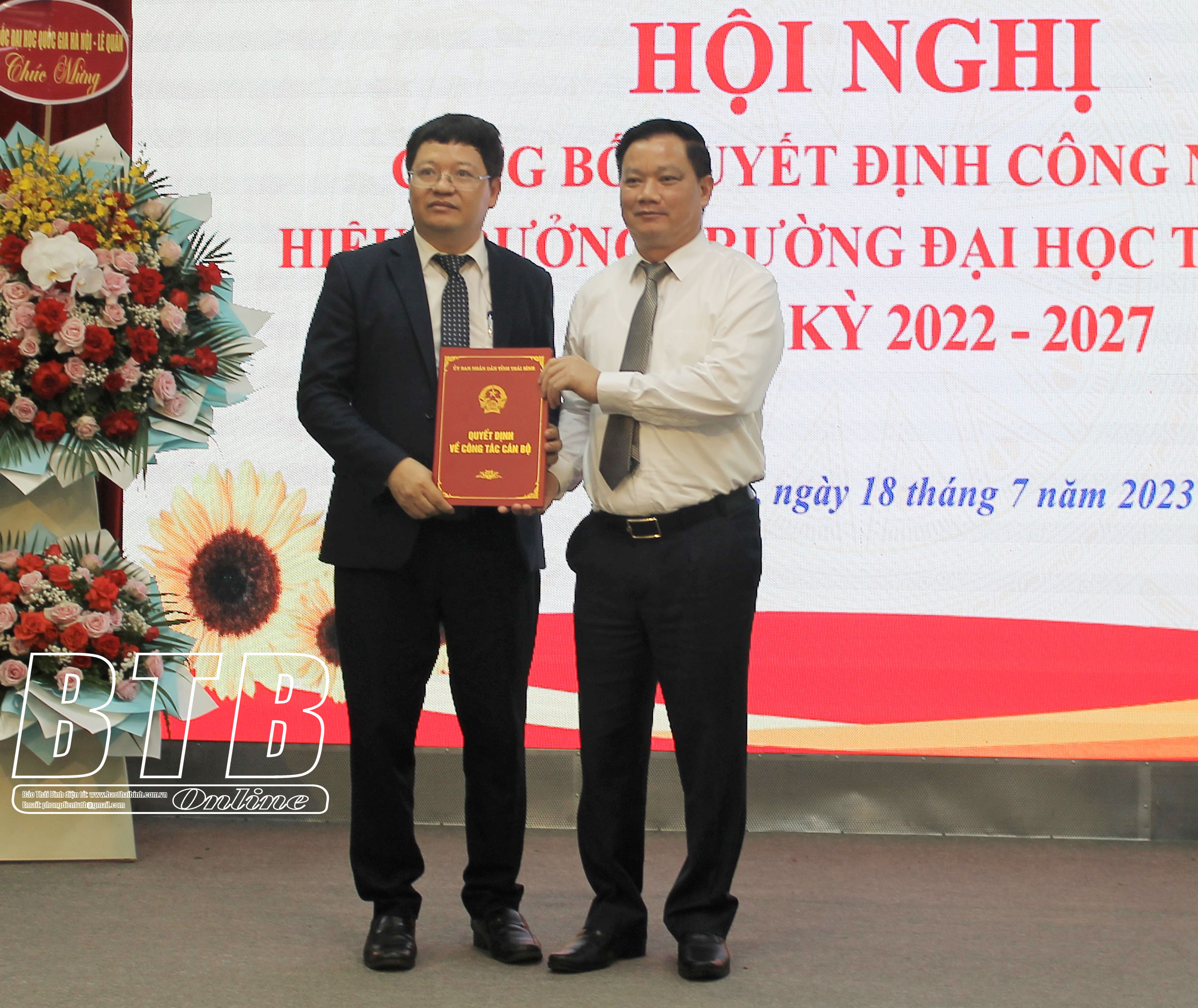 Hội nghị đã công bố Quyết định số 1516/QĐ-UBND ngày 14/7/2023 của UBND tỉnh, công nhận Phó Giáo sư, Tiến sĩ Phạm Quốc Thành, Trưởng khoa Khoa học Chính trị, Trường Đại học Khoa học Xã hội và Nhân văn, Đại học Quốc gia Hà Nội giữ chức vụ Hiệu trưởng Trường Đại học Thái Bình, nhiệm kỳ 2022 - 2027 kể từ ngày 18/7/2023.