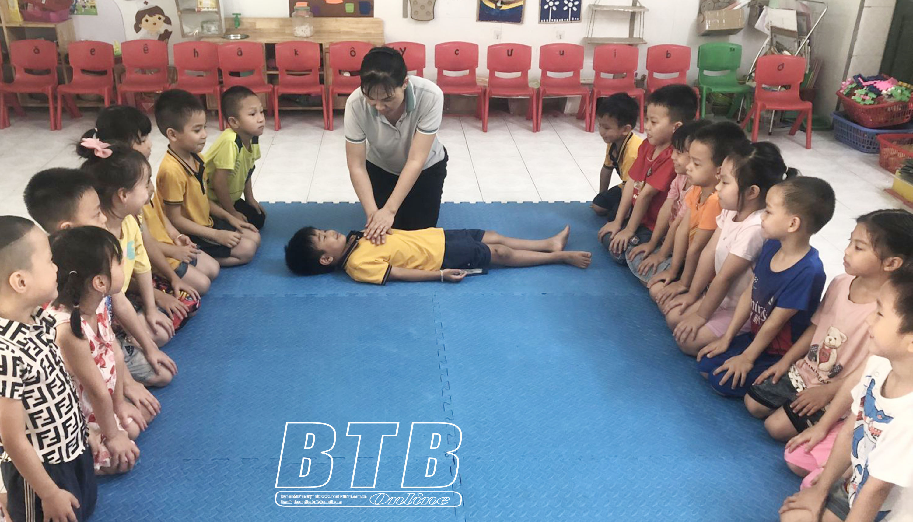 Giáo viên Trường Mầm non Thụy Tân (Thái Thụy) hướng dẫn trẻ cách phòng, chống và sơ cứu khi bị đuối nước.