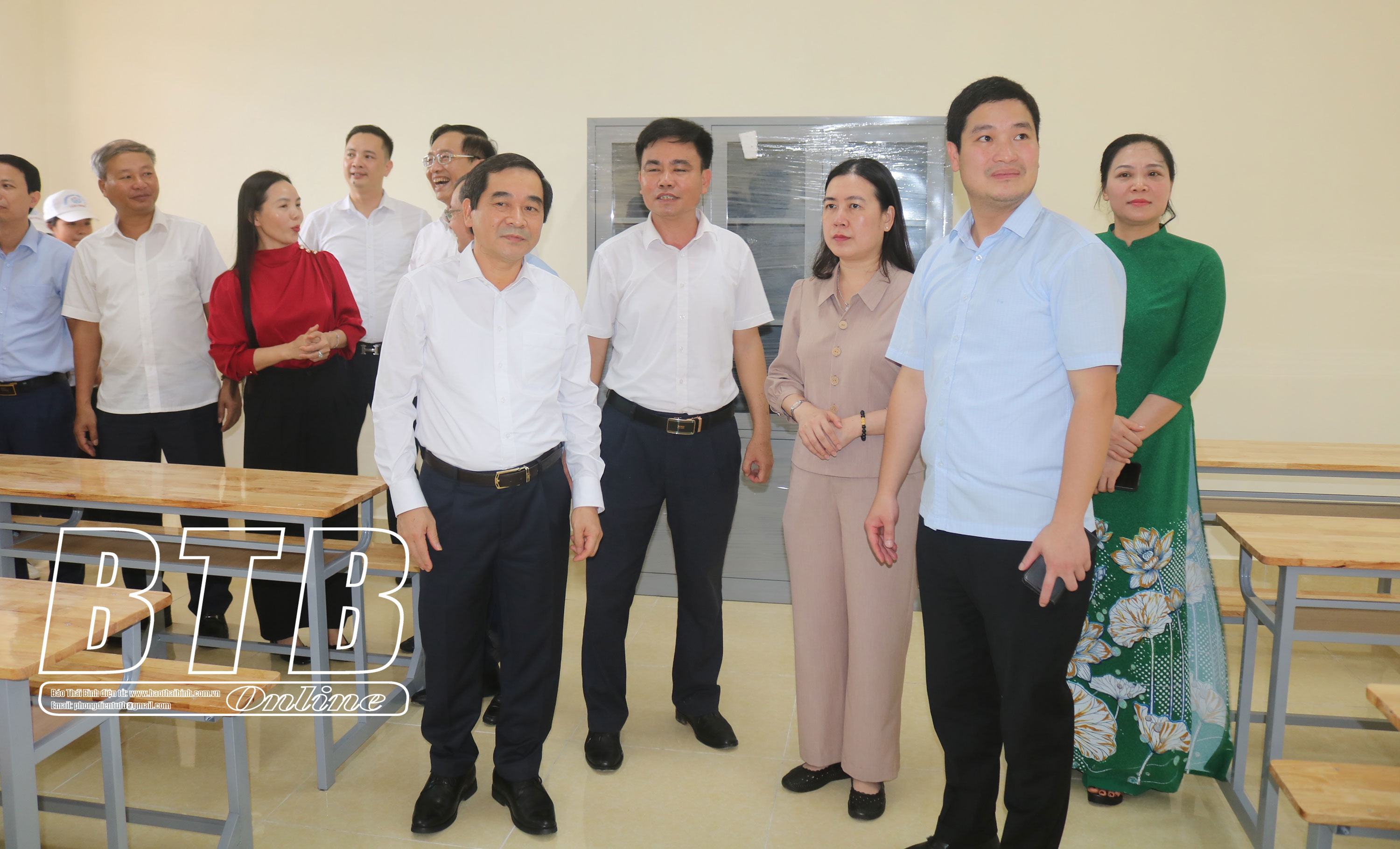 Đồng chí Nguyễn Tiến Thành, Phó Bí thư thường trực Tỉnh ủy, Chủ tịch HĐND tỉnh cùng các đồng chí lãnh đạo tỉnh tham quan dãy phòng học mới của Trường THCS Tân Phong (Vũ Thư).