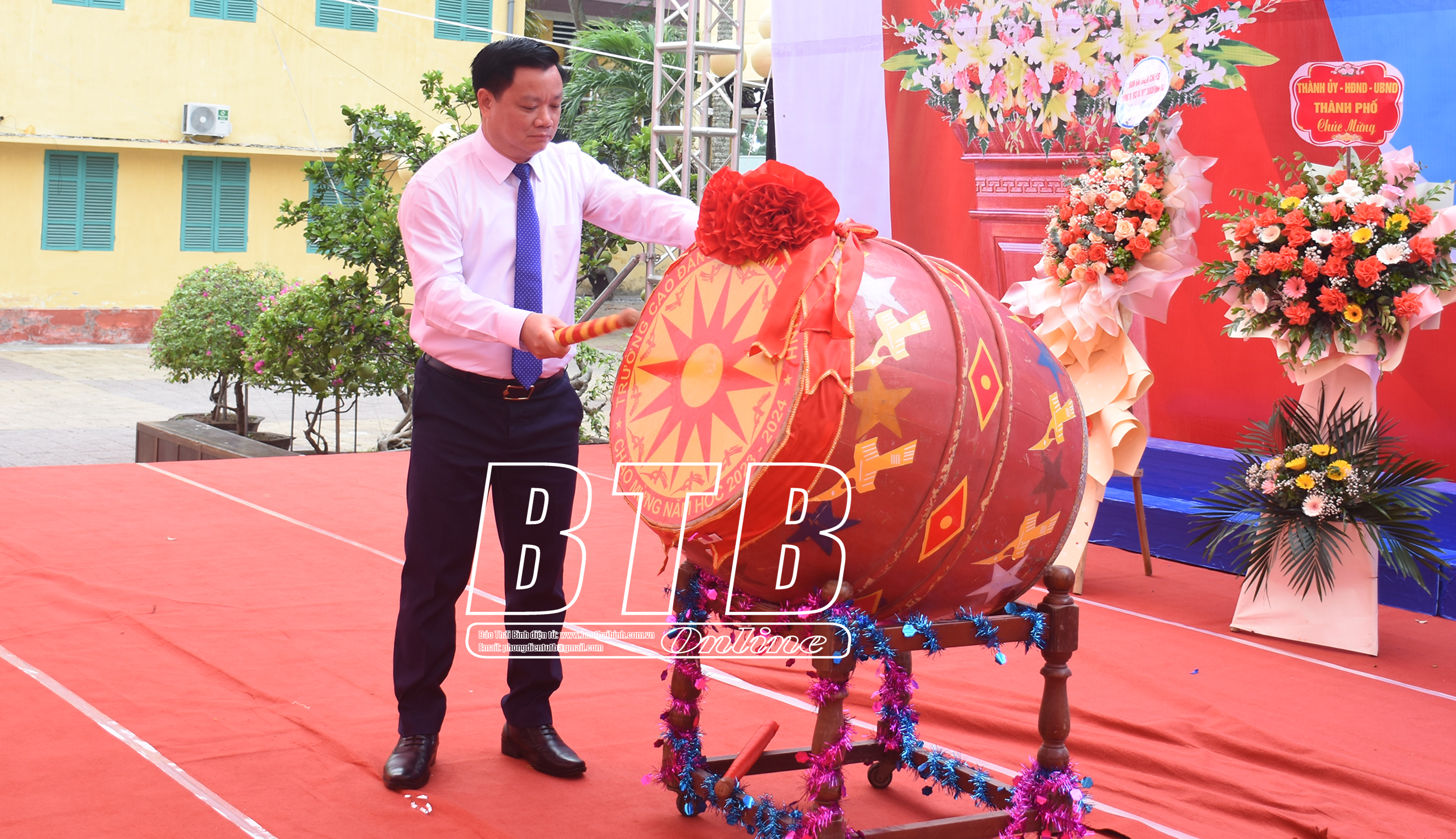 Đồng chí Nguyễn Khắc Thận, Phó Bí thư Tỉnh ủy, Chủ tịch UBND tỉnh đánh trống khai giảng năm học mới.