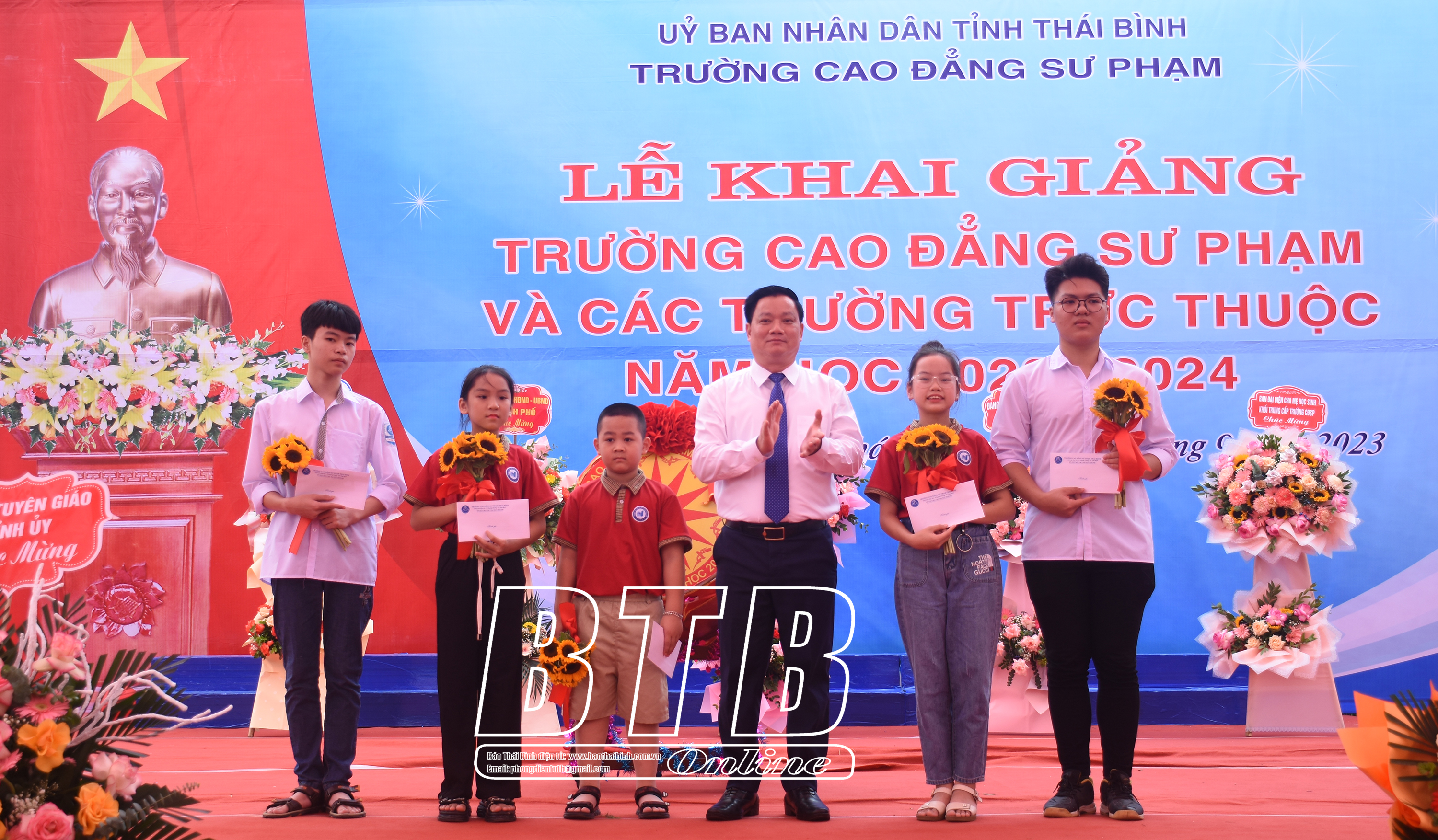 Đồng chí Nguyễn Khắc Thận, Phó Bí thư Tỉnh ủy, Chủ tịch UBND tỉnh tặng hoa chúc mừng thầy và trò Trường Cao đẳng Sư phạm Thái Bình nhân dịp khai giảng năm học mới.