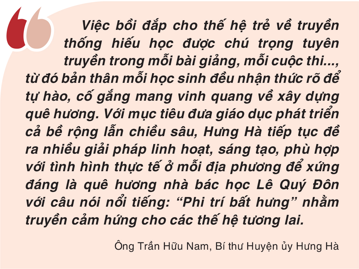 Nhìn lại chặng đường hình thành và phát triển, Hưng Hà đã hình thành nên những truyền thống văn hóa độc đáo, trong đó truyền thống hiếu học như một mạch nguồn bền sâu, nuôi dưỡng bao thế hệ hiền tài cho quê hương, đất nước. Không chỉ là nơi có nhiều danh nhân, danh tướng gắn với những trang sử hào hùng của dân tộc qua các triều đại Đinh, Lý, Trần, Lê..., Hưng Hà còn là vùng quê phát tích và dựng nghiệp nhà Trần gắn với tên tuổi của những danh nhân sáng nghiệp như Thống quốc Thái sư Trần Thủ Độ, Linh từ Quốc mẫu Trần Thị Dung... Cùng với đó, nhân dân Hưng Hà còn tự hào là vùng quê “văn hiến truyền gia”, hiếu học, khoa bảng - nơi sinh ra nhiều người con ưu tú đỗ đạt, thành danh tiêu biểu như: Tam nguyên Trạng nguyên Phạm Đôn Lễ, Lễ nghi học sĩ Nguyễn Thị Lộ, nhà văn hóa Nguyễn Tông Quai, nhà bác học Tam nguyên Bảng nhãn Lê Quý Đôn, Kỳ đồng Nguyễn Văn Cẩm...