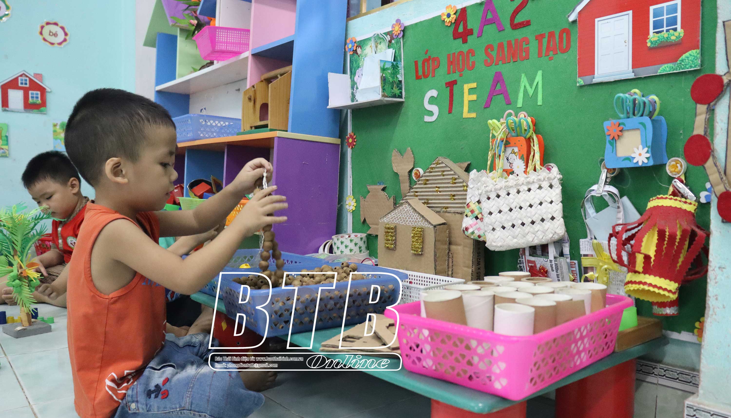 Dẫn chúng tôi tham quan một số lớp học của nhà trường, ông Lại Công Hoan, Hiệu trưởng nhà trường cho biết: Nhà trường đã có nhiều cách làm hay, sáng tạo và đã đạt được kết quả tích cực từ khi thực hiện chuyên đề xây dựng trường mầm non lấy trẻ làm trung tâm. Ở môi trường giáo dục này, thay vì luôn là người truyền thụ kiến thức, trẻ nghe, tiếp thu và thực hiện theo mẫu hoặc theo yêu cầu, giáo viên chỉ là người định hướng, khơi gợi để trẻ phát huy những hiểu biết, kinh nghiệm của mình để cùng nhau tìm hiểu một vấn đề, tạo cơ hội để trẻ phán đoán, đưa ra câu hỏi, ý kiến xây dựng bài dựa trên những hiểu biết của bản thân. Chuyên đề đã giúp trẻ mạnh dạn, tự tin, chủ động, nhanh nhẹn hoạt bát hơn trong giao tiếp, tham gia tích cực vào các hoạt động giáo dục. Để thực hiện hiệu quả chuyên đề, nhà trường đã phân công nhiệm vụ cụ thể cho các đồng chí phụ trách các tổ, hướng dẫn giáo viên đăng ký nội dung giảng dạy, tham gia đầy đủ các buổi tập huấn chuyên môn do ngành tổ chức, tích cực tổ chức các hoạt động trên các nhóm lớp, các hoạt động dự giờ lên lớp, tổ chức các kỳ hội giảng, hội thi. Nhà trường chỉ đạo các nhóm lớp, đội ngũ giáo viên trang trí lớp theo từng chủ đề của năm học. Từ đó giáo viên phải sưu tầm, nghiên cứu, học hỏi những nguyên vật liệu quen thuộc như bìa cát tông, chai nhựa... để làm ra những đồ dùng, đồ chơi cho trẻ hoạt động. Kết quả, 100% nhóm lớp đã xây dựng được môi trường trong lớp lấy trẻ làm trung tâm, trang trí lớp phong phú đa dạng; đồ dùng tự làm phong phú về thể loại góp phần đưa cảnh quan môi trường sư phạm của nhà trường ngày càng xanh, sạch, đẹp. Cùng với đó, nhà trường tiếp tục thực hiện phương pháp giáo dục steam để trẻ được thực hành, sử dụng những đồ dùng học liệu, được thực hành trải nghiệm và kích thích được tính tò mò, ham hiểu biết của trẻ. Vì thế đã có nhiều sản phẩm được trẻ làm ra, trong đó cô giáo chỉ cung cấp nguyên liệu và hướng dẫn để trẻ tự làm. Các lớp học được thiết kế theo cách tận dụng không gian để cho trẻ hoạt động bảo đảm phù hợp, linh hoạt, đa dạng và phong phú, các góc học tập mang tính mở, tạo điều kiện cho trẻ dễ dàng tự lựa chọn và sử dụng đồ dùng, đồ chơi thực hành trải nghiệm. Ngoài việc tổ chức trong trường giáo viên còn tổ chức cho trẻ đi tham quan, trải nghiệm môi trường bên ngoài, khám phá thực tế ở địa phương.