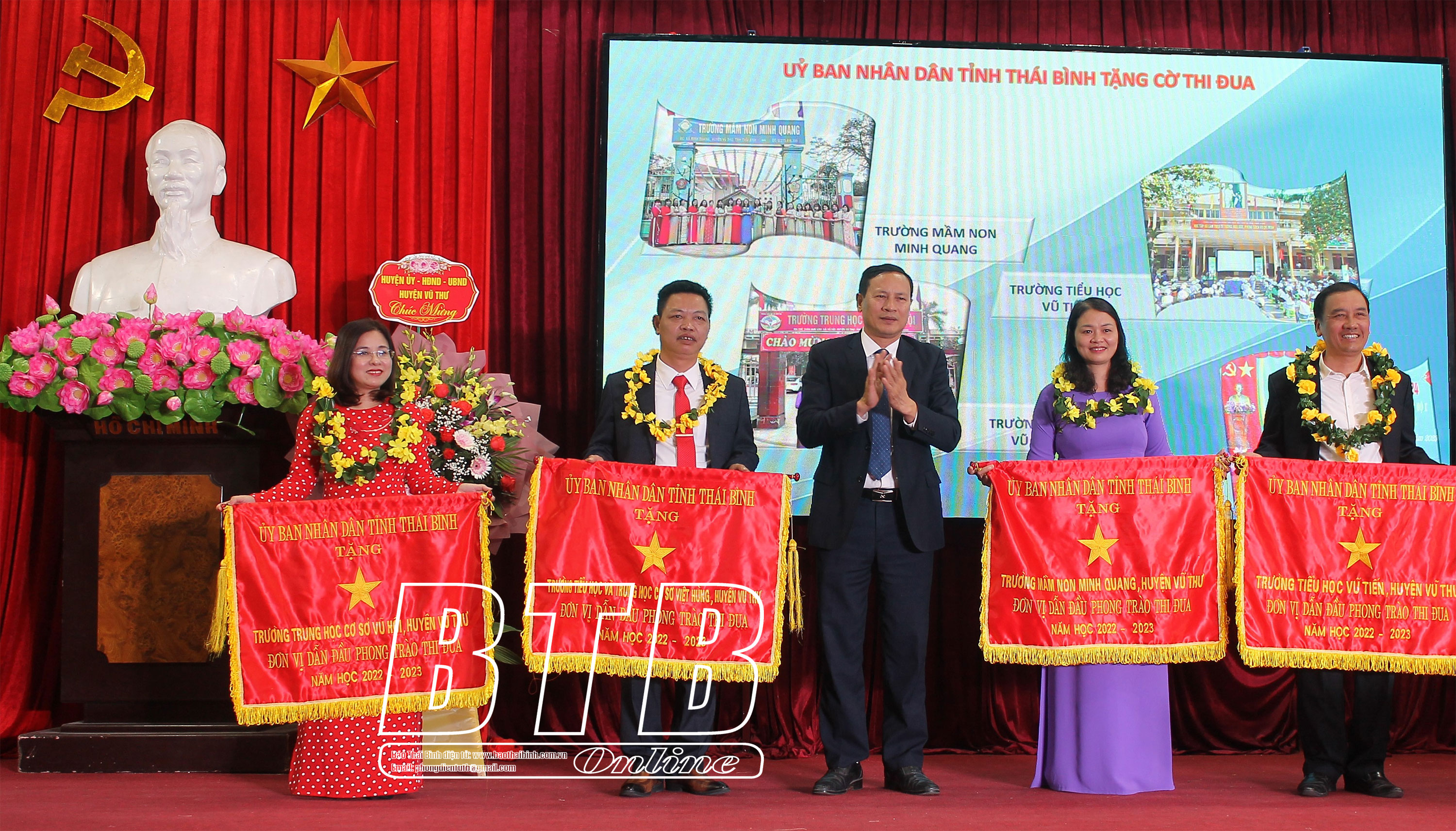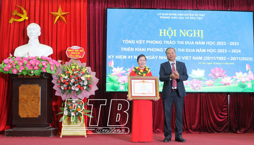 Nhân dịp này, các đồng chí lãnh đạo Sở Giáo dục và Đào tạo, huyện Vũ Thư đã trao bằng khen của Thủ tướng Chính phủ, 4 bằng khen của Bộ trưởng Bộ Giáo dục và Đào tạo, 32 cờ thi đua và bằng khen của Chủ tịch UBND tỉnh cho các tập thể, cá nhân có thành tích xuất sắc trong năm học 2022 – 2023.