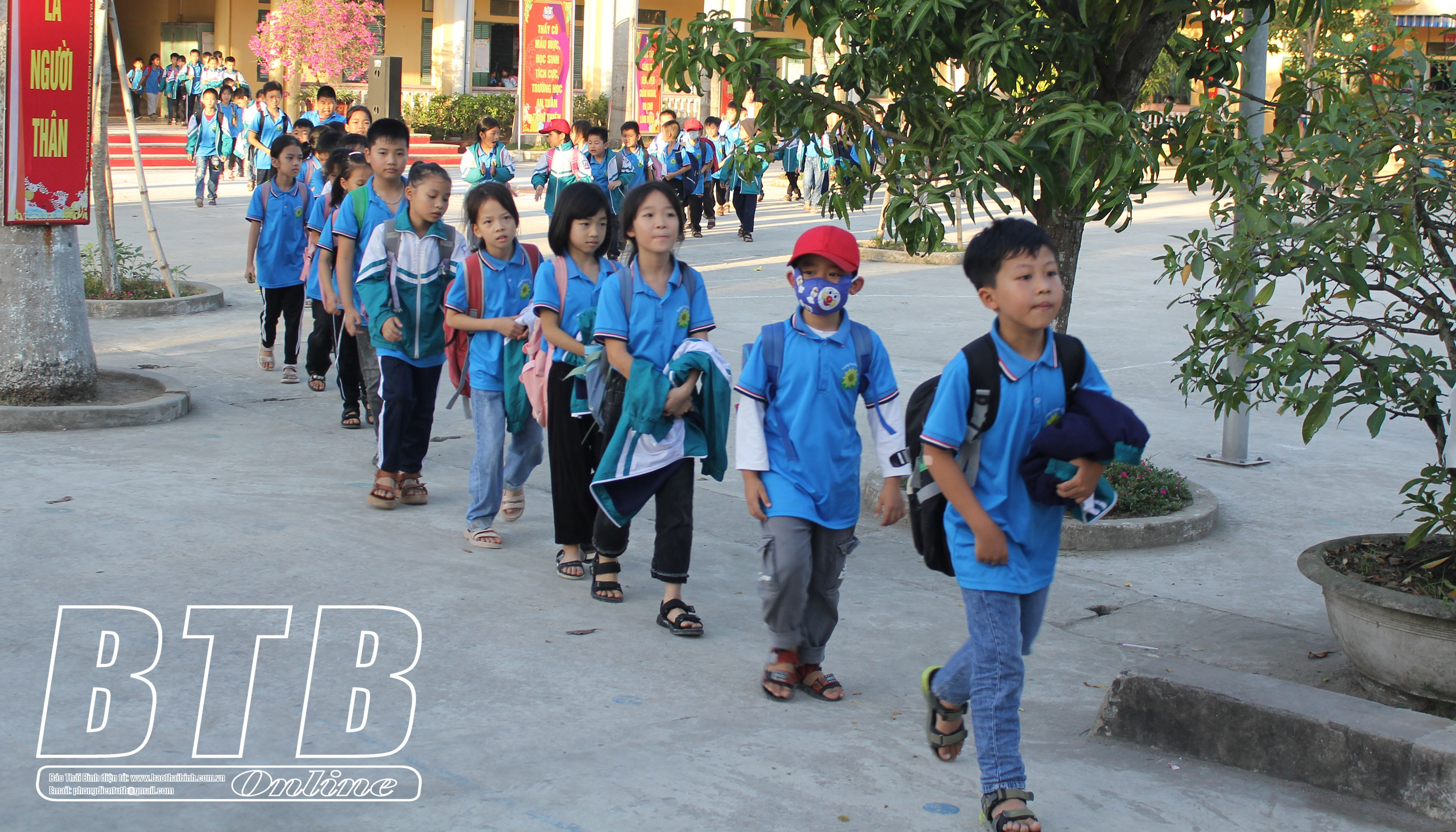 Học sinh Trường Tiểu học Việt Thuận xếp hàng ngay ngắn để bảo đảm trật tự an toàn giao thông khi tan trường.