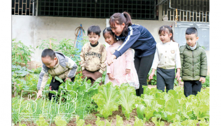 Cô giáo Trường Mầm non Hồng Nhung (thành phố Thái Bình) hướng dẫn trẻ nhận biết các loại rau.