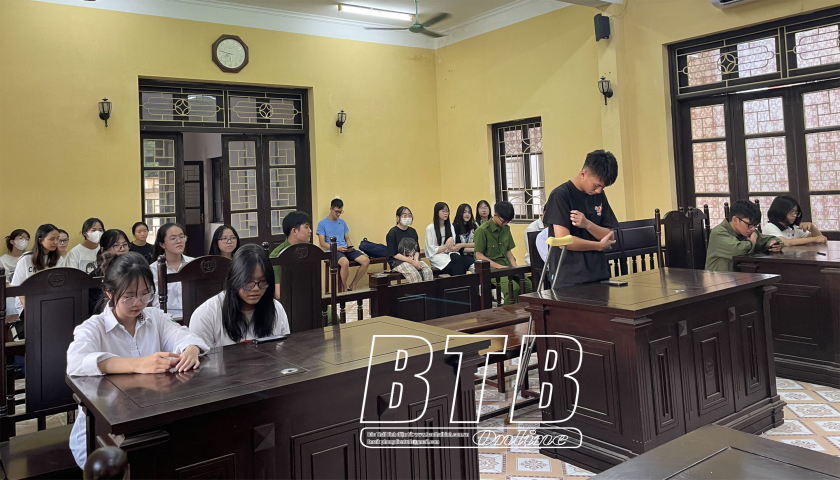Phiên tòa giả định xét xử sơ thẩm đối với Nguyễn Mạnh Đ về tội “Vi phạm quy định về tham gia giao thông đường bộ” vừa được tổ chức thu hút sự tham gia của giáo viên, học sinh. Tình huống đặt ra là khoảng 13 giờ ngày 10/8/2023, Nguyễn Mạnh Đ (học lớp 10, chưa có giấy phép lái xe) tự ý lấy xe mô tô Honda Wave α, biển kiểm soát 17B1-199.86 của bố đẻ (ông Nguyễn Mạnh C) đến nhà bạn chơi. Khi đi đến ngã tư khu vực siêu thị Go Thái Bình, do không đội mũ bảo hiểm, không chú ý quan sát nên xe do Đ điều khiển va chạm với xe mô tô do anh Phùng Văn T điều khiển. Hậu quả, anh T bị thương nặng, được đưa đi bệnh viện cấp cứu kịp thời nhưng không qua khỏi... Sau khi phiên tòa giả định kết thúc, học sinh đã có nhiều câu hỏi liên quan đến vụ án được đề cập trong phiên tòa để giao lưu với các chuyên gia. Qua phiên tòa giả định, giúp các em học sinh có thêm nhiều kiến thức pháp luật và rút ra cho mình nhưng bài học bổ ích khi tham gia giao thông.
