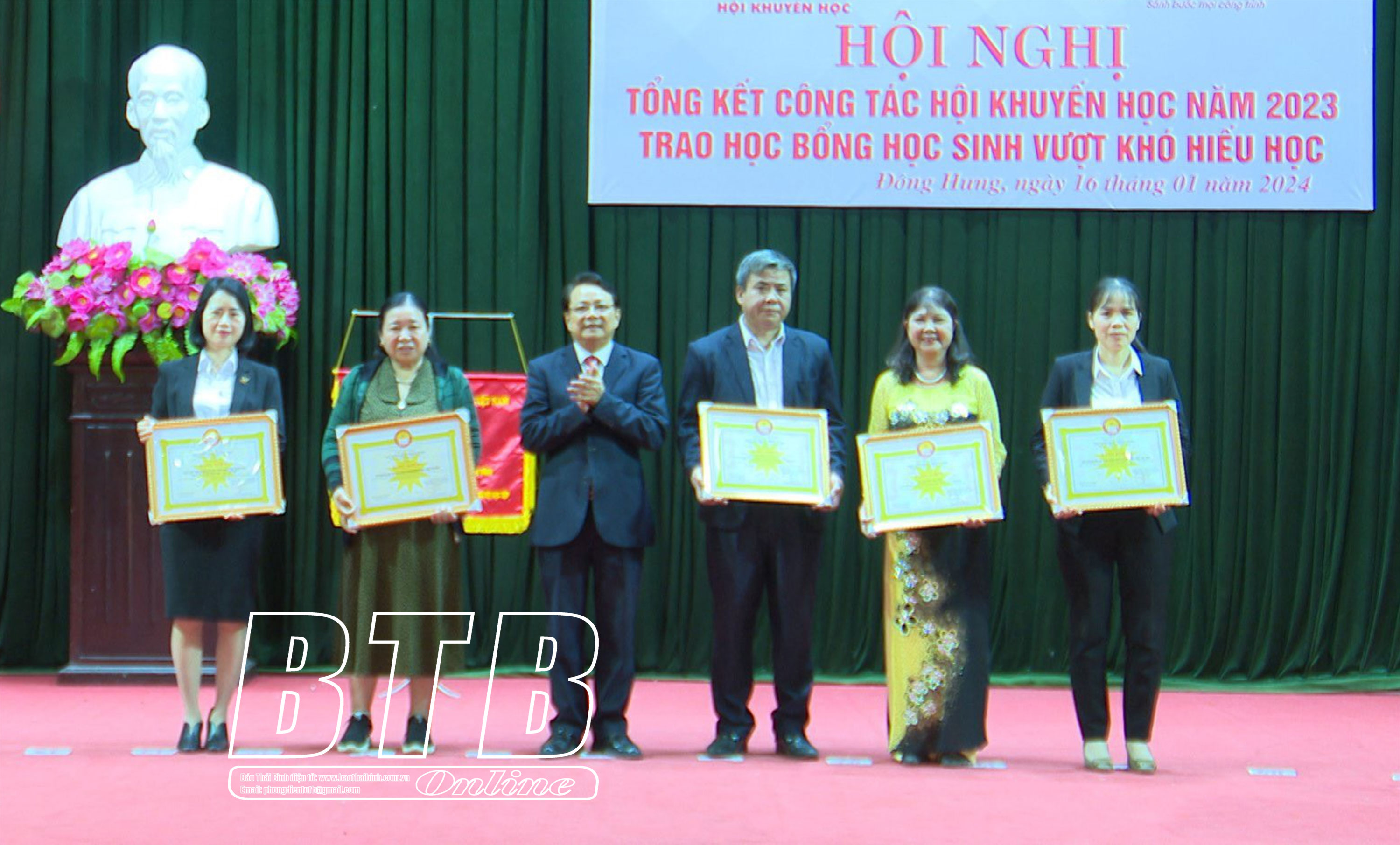 Tại hội nghị, Hội Khuyến học huyện Đông Hưng và Hội Khuyến học xã Hồng Giang được Trung ương Hội Khuyến học Việt Nam tặng cờ thi đua đơn vị xuất sắc; các cấp hội khuyến học, UBND huyện Đông Hưng trao giấy khen cho các tập thể, cá nhân có thành tích xuất sắc và các mô hình học tập tiêu biểu năm 2023. Nhân dịp này, 30 học sinh vượt khó hiếu học được trao học bổng và quà.