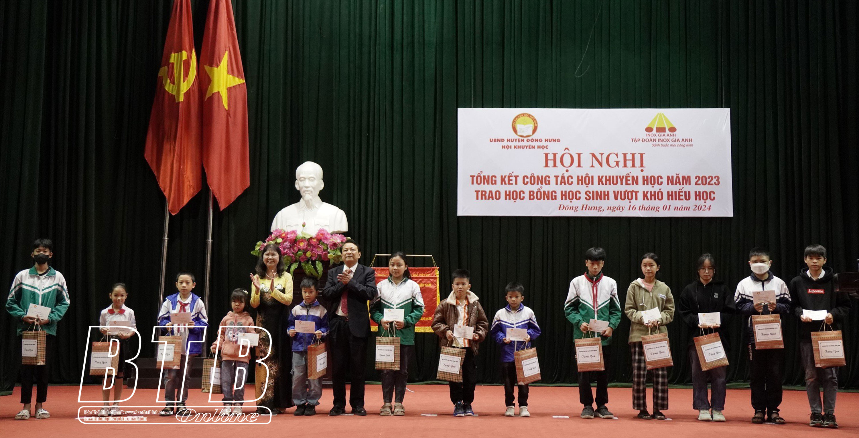 Lãnh đạo Hội Khuyến học tỉnh và Hội Khuyến học huyện Đông Hưng trao học bổng, quà cho học sinh vượt khó hiếu học.