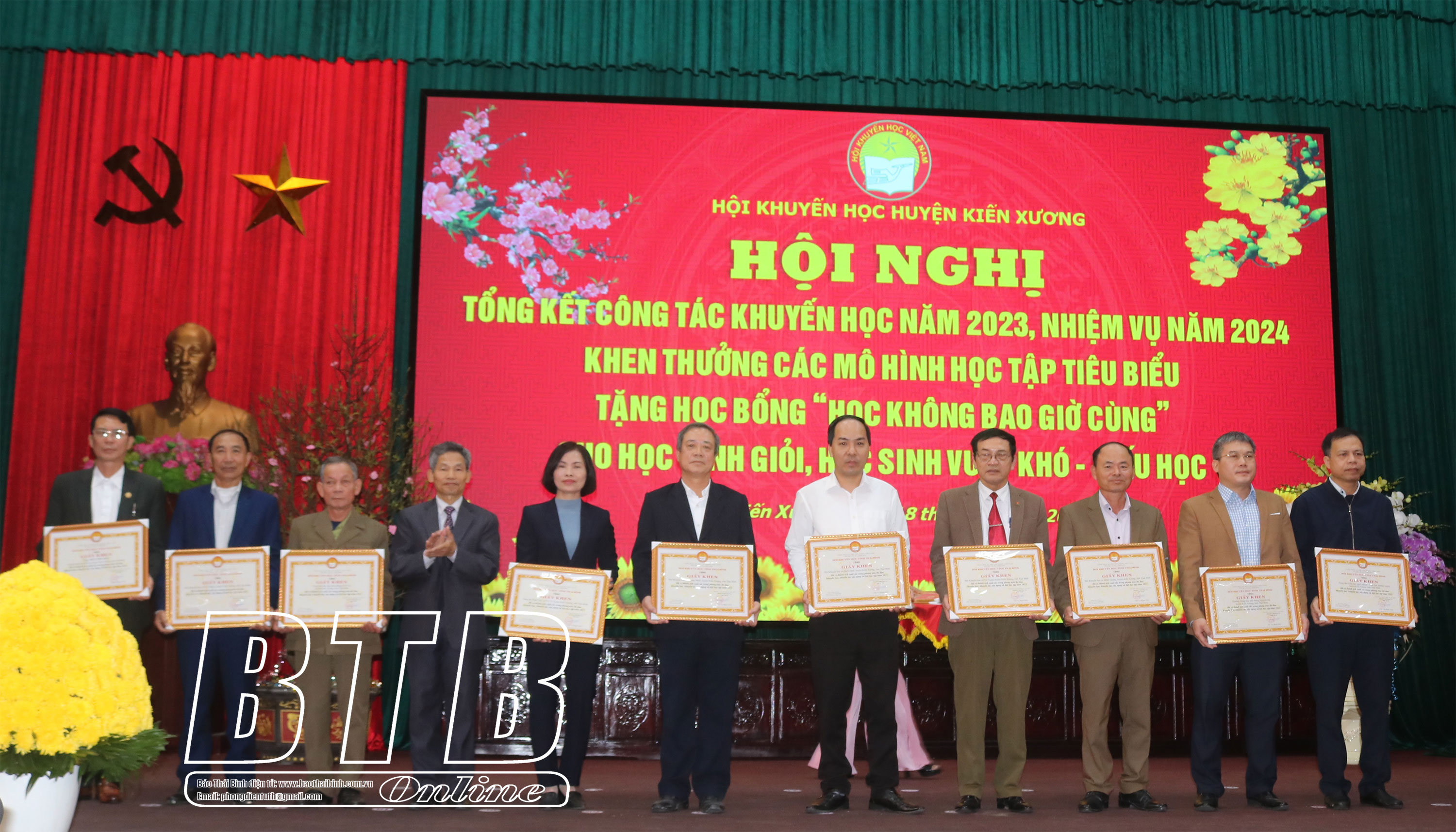 Năm 2023, Hội Khuyến học huyện Kiến Xương thực hiện tốt công tác tham mưu cho cấp ủy, chính quyền, Ban Chỉ đạo xã dựng xã hội học tập huyện; đồng thời thực hiện tốt việc củng cố, kiện toàn và phát triển tổ chức hội các cấp. Đến nay, toàn huyện có 51 hội khuyến học cơ sở, 338 chi hội, 577 ban khuyến học với 92.688 hội viên, chiếm 39,22% dân số. Việc thực hiện Quyết định số 387/QĐ-TTg về “Đẩy mạnh phong trào học tập suốt đời trong gia đình, dòng họ, cộng đồng, đơn vị giai đoạn 2021 – 2030” và Quyết định số 677/QĐ-TTg về “Xây dựng mô hình công dân học tập giai đoạn 2021 – 2030” đạt kết quả cao. Quỹ khuyến học toàn huyện hiện đạt trên 13,3 tỷ đồng, đã tổ chức khen thưởng, tặng quà cho gần 11 nghìn lượt học sinh, sinh viên và người lao động với tổng số tiền trên 1 tỷ đồng. Hết năm 2023, huyện có 30 tập thể, cá nhân được nhận cờ thi đua xuất sắc dẫn đầu, bằng khen và kỷ niệm chương của Hội Khuyến học Việt Nam; 14 tập thể, cá nhân được nhận giấy khen của Hội Khuyến học tỉnh.