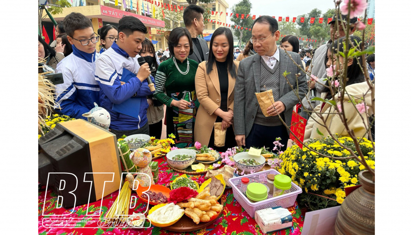 Lãnh đạo Phòng Giáo dục và đào tạo và nhà trường thăm các gian hàng ẩm thực.
