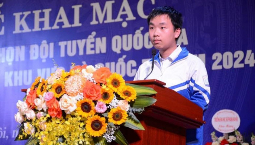 Thí sinh Tạ Đức Anh, Trường THPT chuyên Đại học Sư phạm Hà Nội, đại diện cho 190 thí sinh, phát biểu tại lễ khai mạc kỳ thi (Ảnh: Bộ Giáo dục và Đào tạo)