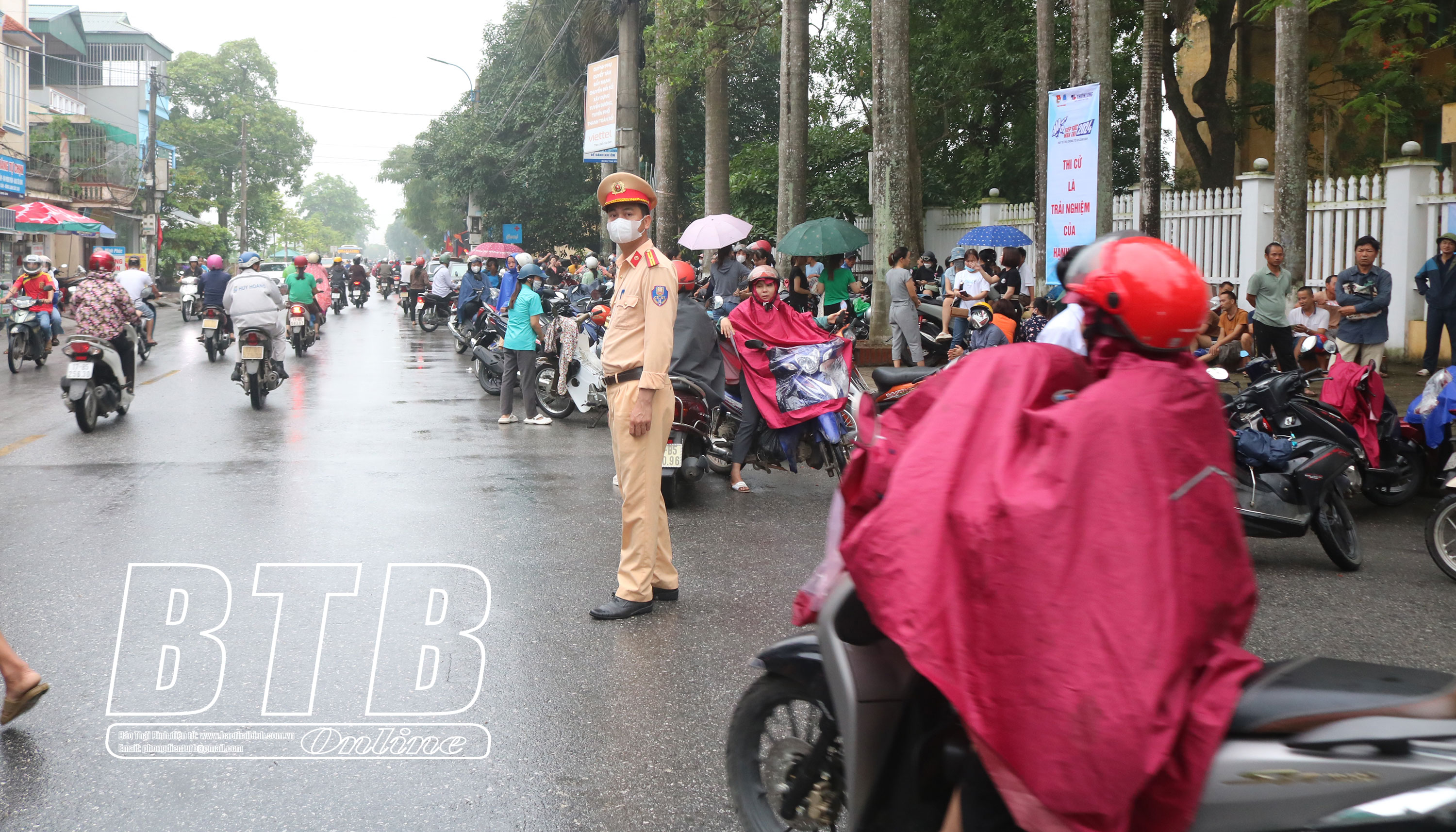 Lực lượng an ninh điều tiết giao thông trước khu vực Hội đồng thi Trường THPT Quỳnh Côi.