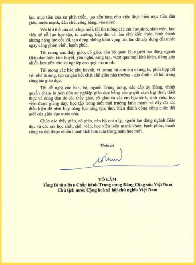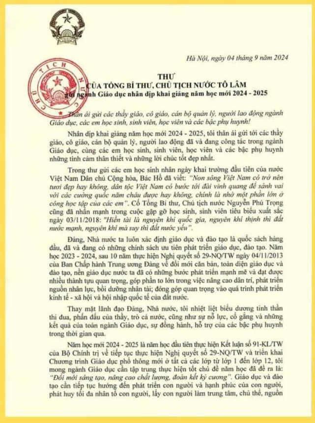 Thư của Tổng Bí thư, Chủ tịch nước gửi ngành Giáo dục nhân dịp khai giảng năm học mới 2024-2025