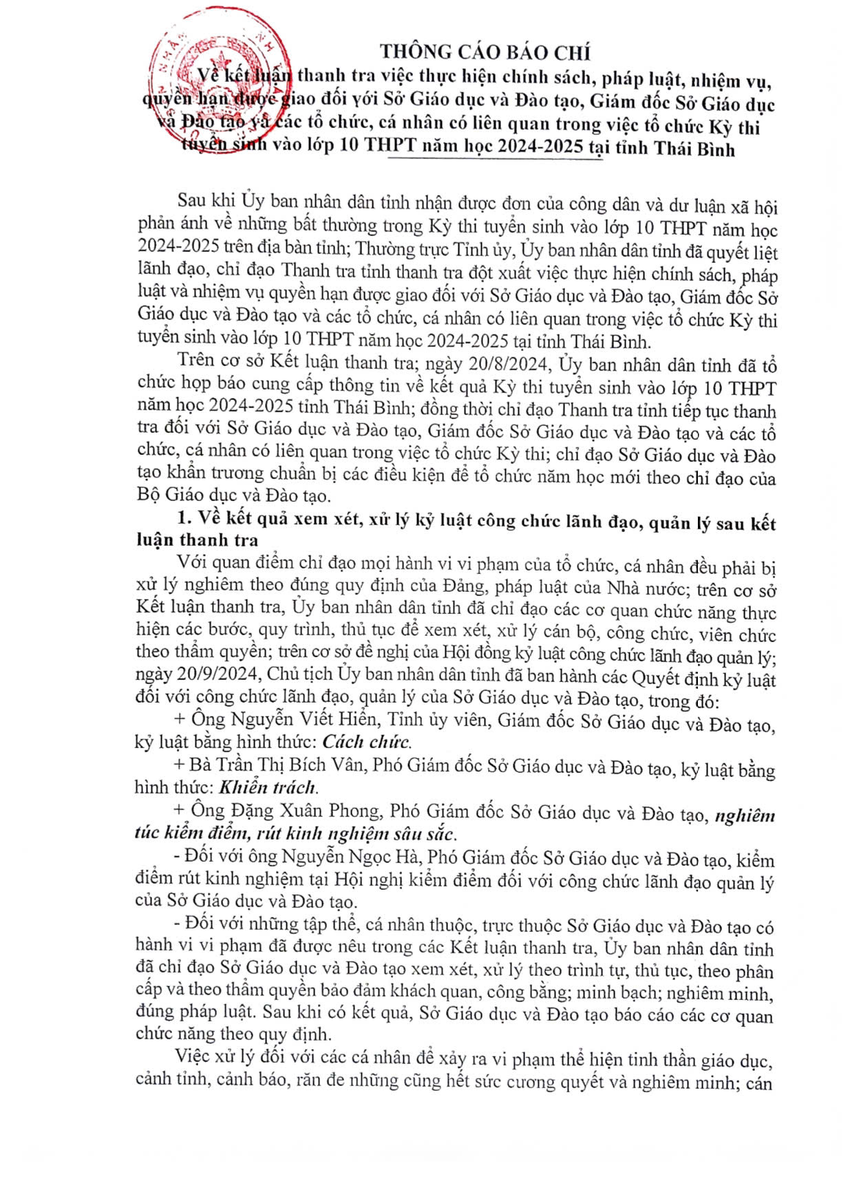 Thông cáo báo chí về kết luận thanh tra việc thực hiện chính sách, pháp luật, nhiệm vụ, quyền hạn được giao đối với Sở Giáo dục và Đào tạo, Giám đốc Sở Giáo dục và Đào tạo và các tổ chức, cá nhân có liên quan trong việc tổ chức Kỳ thi tuyển sinh vào lớp 10 THPT năm học 2024-2025 tại tỉnh Thái Bình.