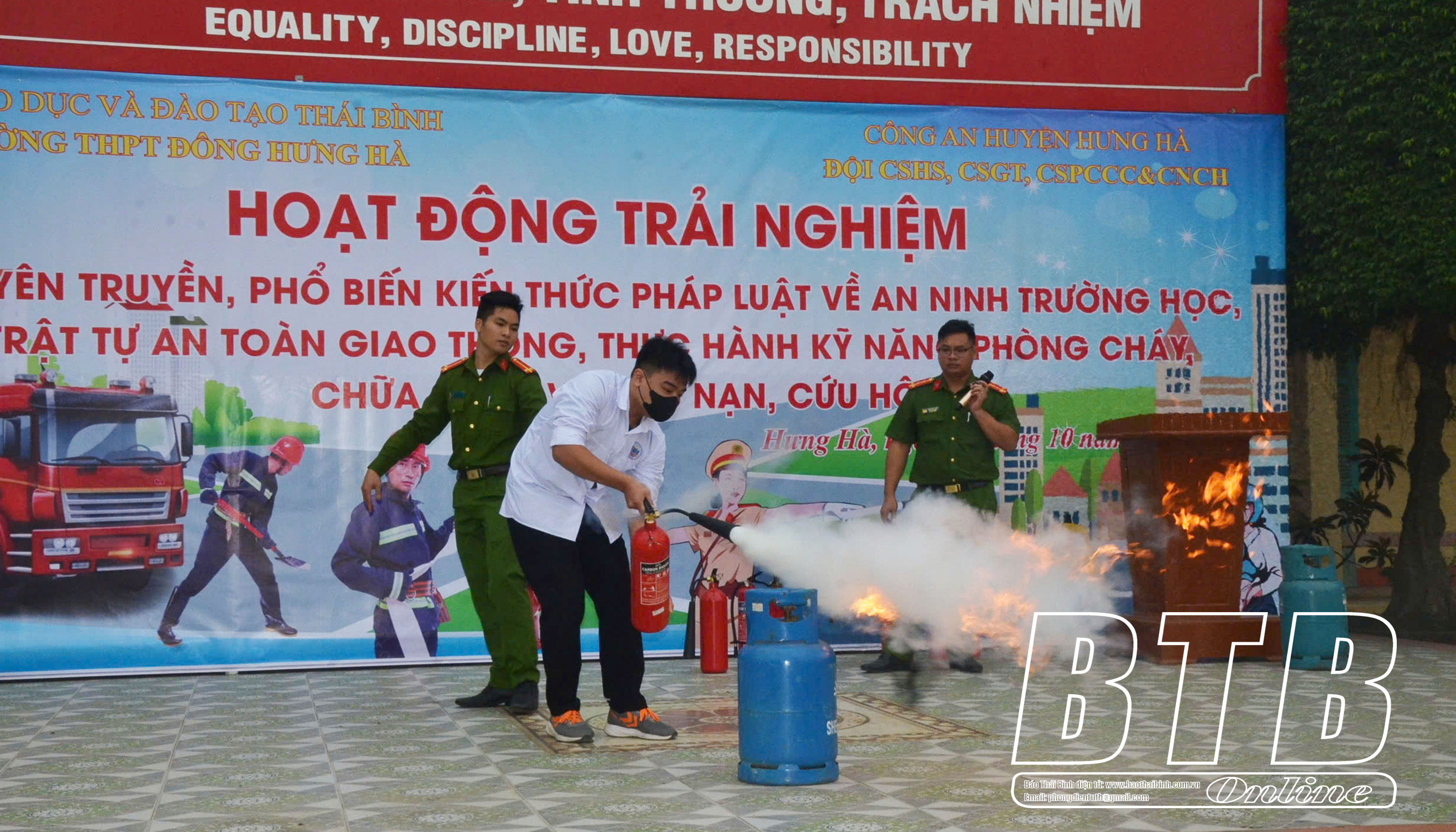 Tại buổi tuyên truyền, cán bộ, giáo viên và học sinh Trường THPT Đông Hưng Hà được thông tin về tình hình trật tự an toàn xã hội, tội phạm kinh tế, ma túy trên địa bàn huyện; tuyên truyền về các phương thức, thủ đoạn hoạt động của các loại tội phạm, trong đó chú trọng vào một số vụ việc như: gây rối trật tự công cộng, vi phạm hình sự, vi phạm không gian mạng, xâm hại tình dục ở lứa tuổi vị thành niên; tình hình trật tự an toàn giao thông trên địa bàn, các nguyên nhân chủ yếu dẫn đến tai nạn giao thông; những lỗi vi phạm lứa tuổi học sinh thường mắc phải; quy tắc khi tham gia giao thông bằng xe đạp điện, xe máy điện, xe gắn máy; xây dựng văn hóa giao thông trong trường học; kỹ năng xử lý các tình huống cháy, nổ và thoát nạn khi xảy ra cháy, nổ tại trường học; giới thiệu trang thiết bị, phương tiện phòng cháy, chữa cháy và hướng dẫn cách sử dụng bình chữa cháy…