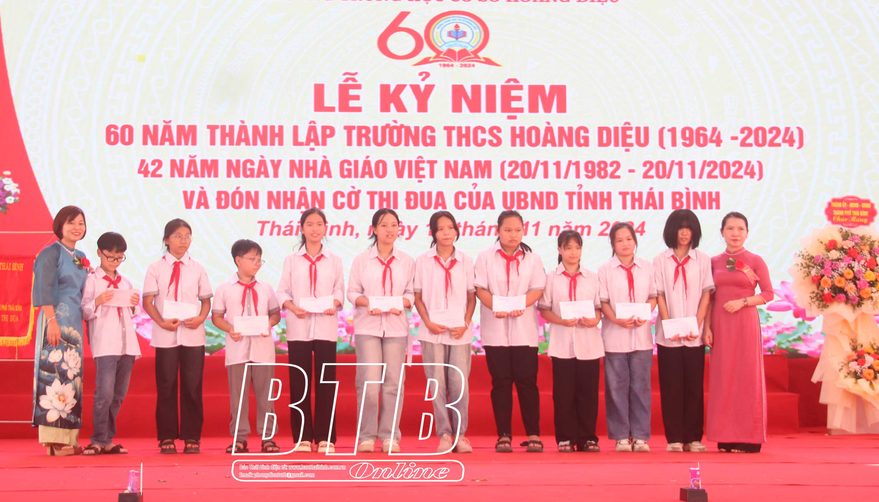 Tại buổi lễ, lãnh đạo UBND thành phố đã trao cờ thi đua của UBND tỉnh cho Trường THCS Hoàng Diệu, đại diện cựu học sinh đã trao quà, học bổng cho 26 em học sinh có hoàn cảnh khó khăn của Trường.