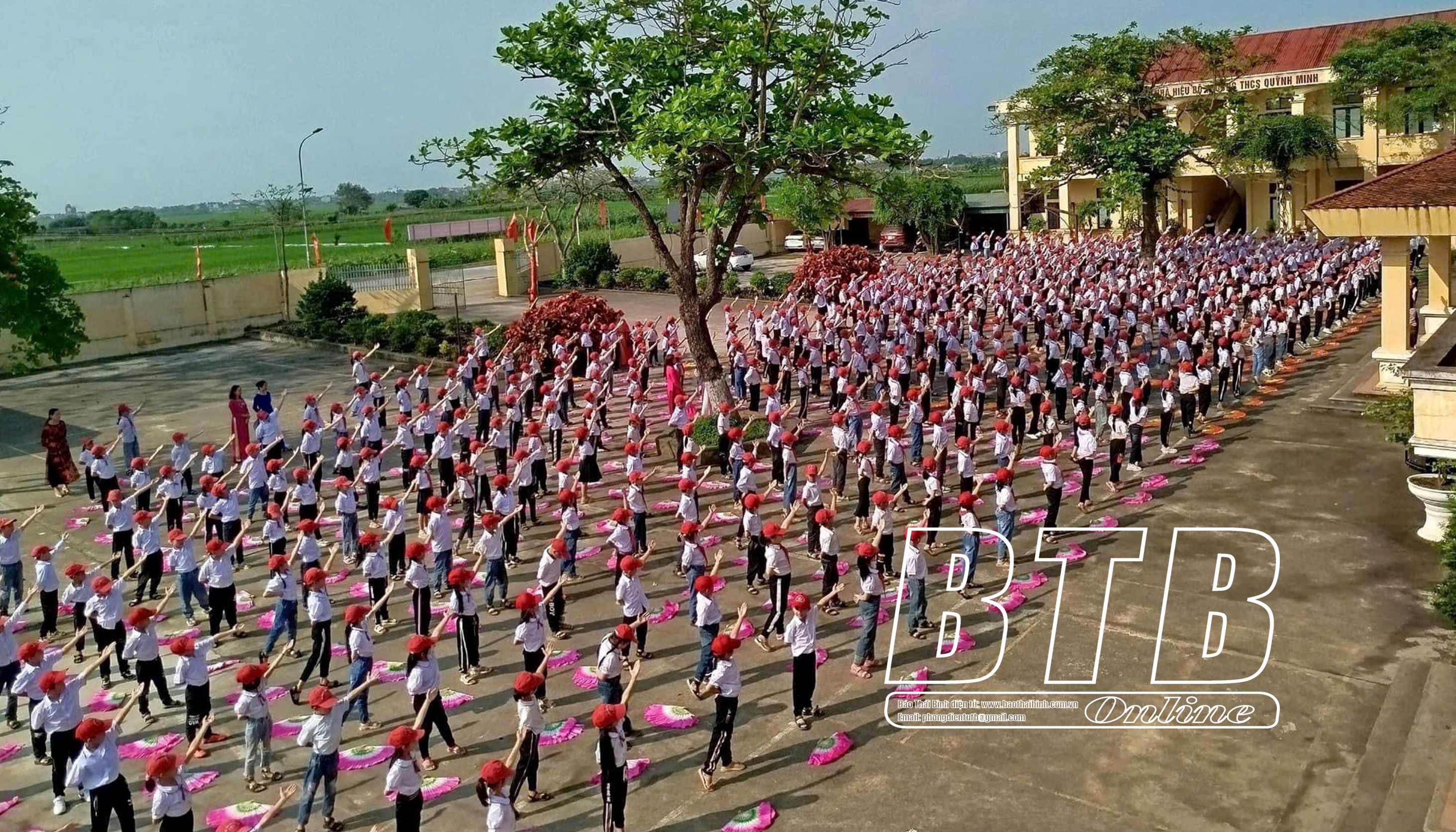 Các em học sinh Trường Tiểu học và THCS Quỳnh Minh (Quỳnh Phụ) đồng diễn văn nghệ.