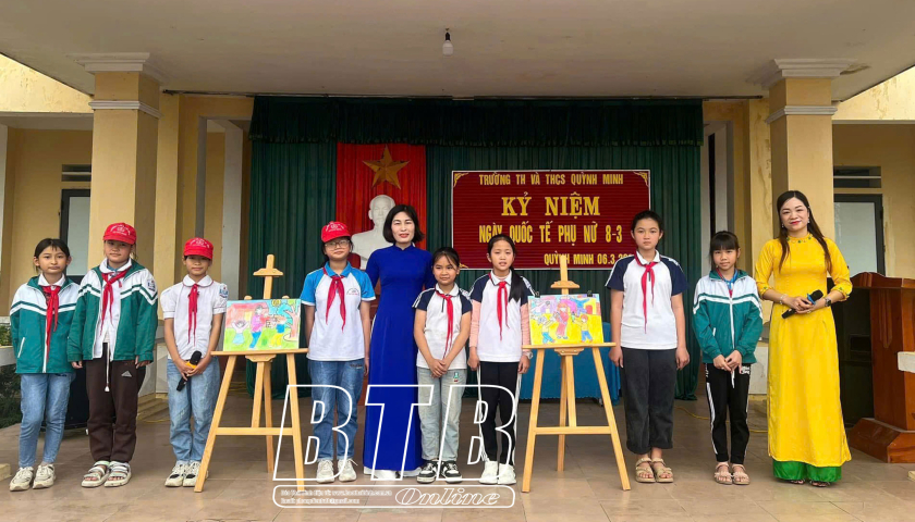 Cô giáo Hoàng Thị Tố Nga (người ngoài cùng bên phải) và các em học sinh trong buổi trao giải cuộc thi vẽ tranh nhân ngày Quốc tế Phụ nữ.