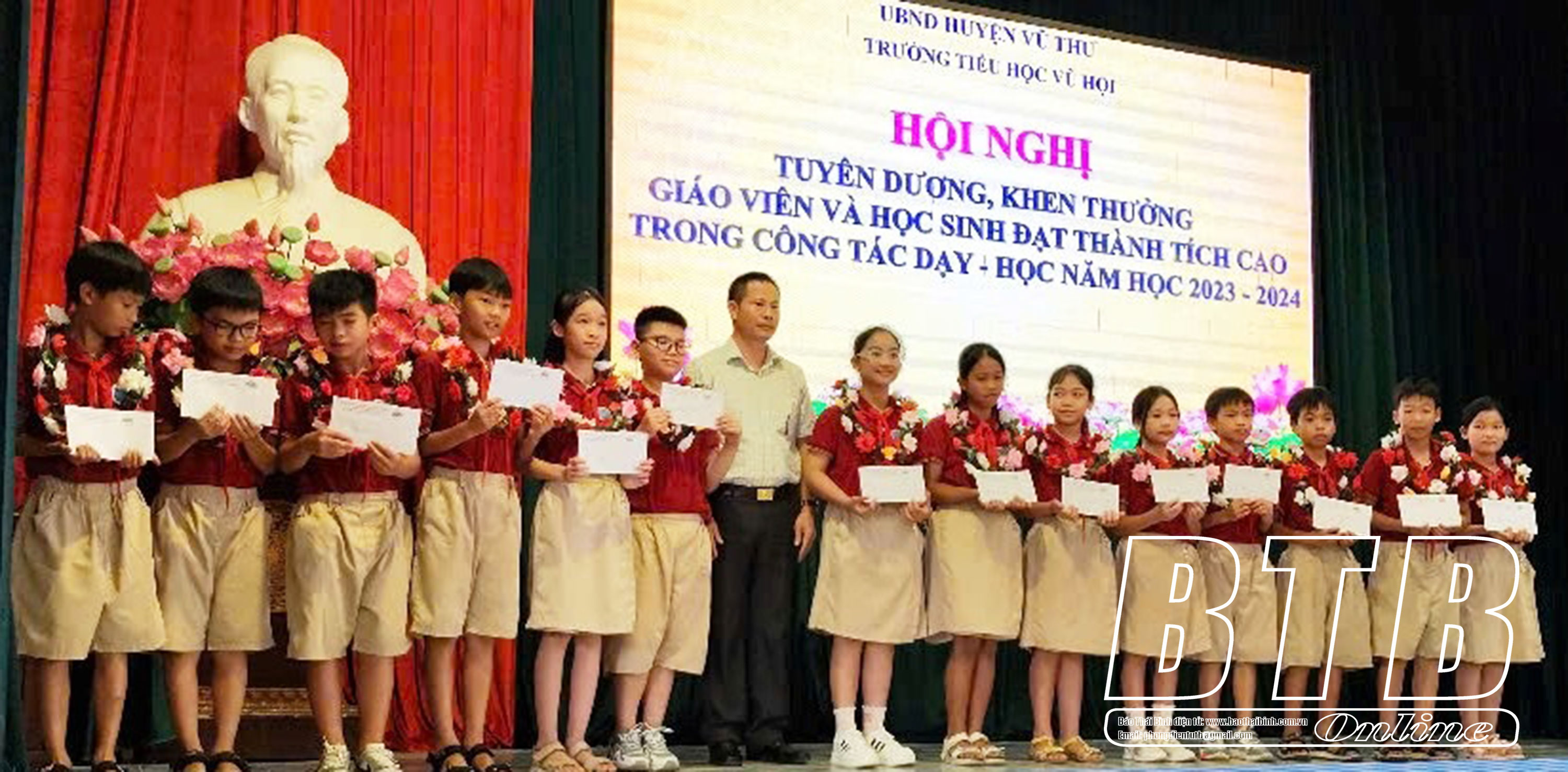 Các em học sinh đạt thành tích cao trong học tập của Trường Tiểu học Vũ Hội nhận khen thưởng.