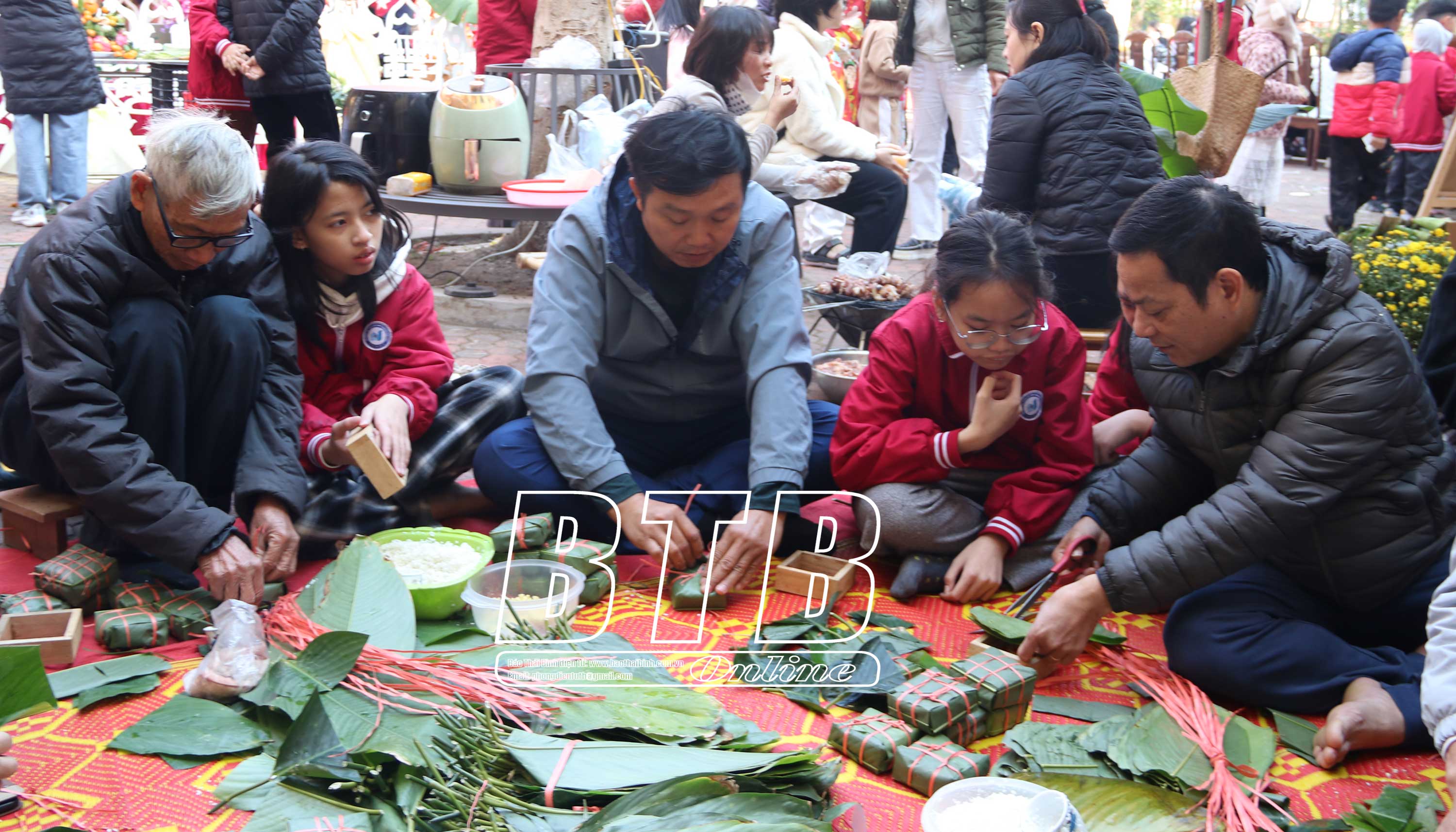 Phụ huynh, học sinh Trường Tiểu học, THCS và THPT Quách Đình Bảo gói bánh chưng.