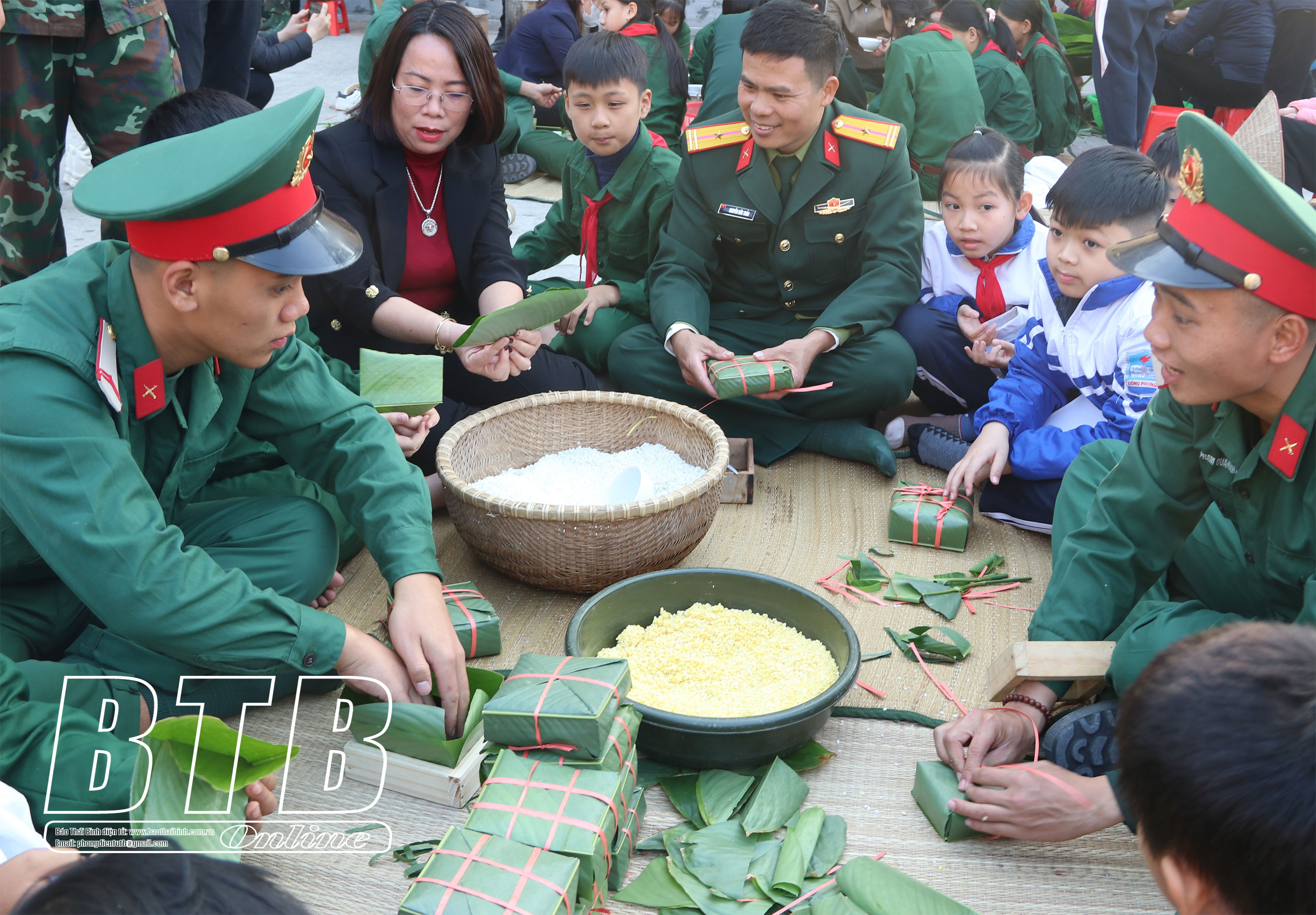Cán bộ, chiến sĩ, giáo viên, học sinh tham gia gói bánh chưng tại Trung đoàn Bộ binh 568.