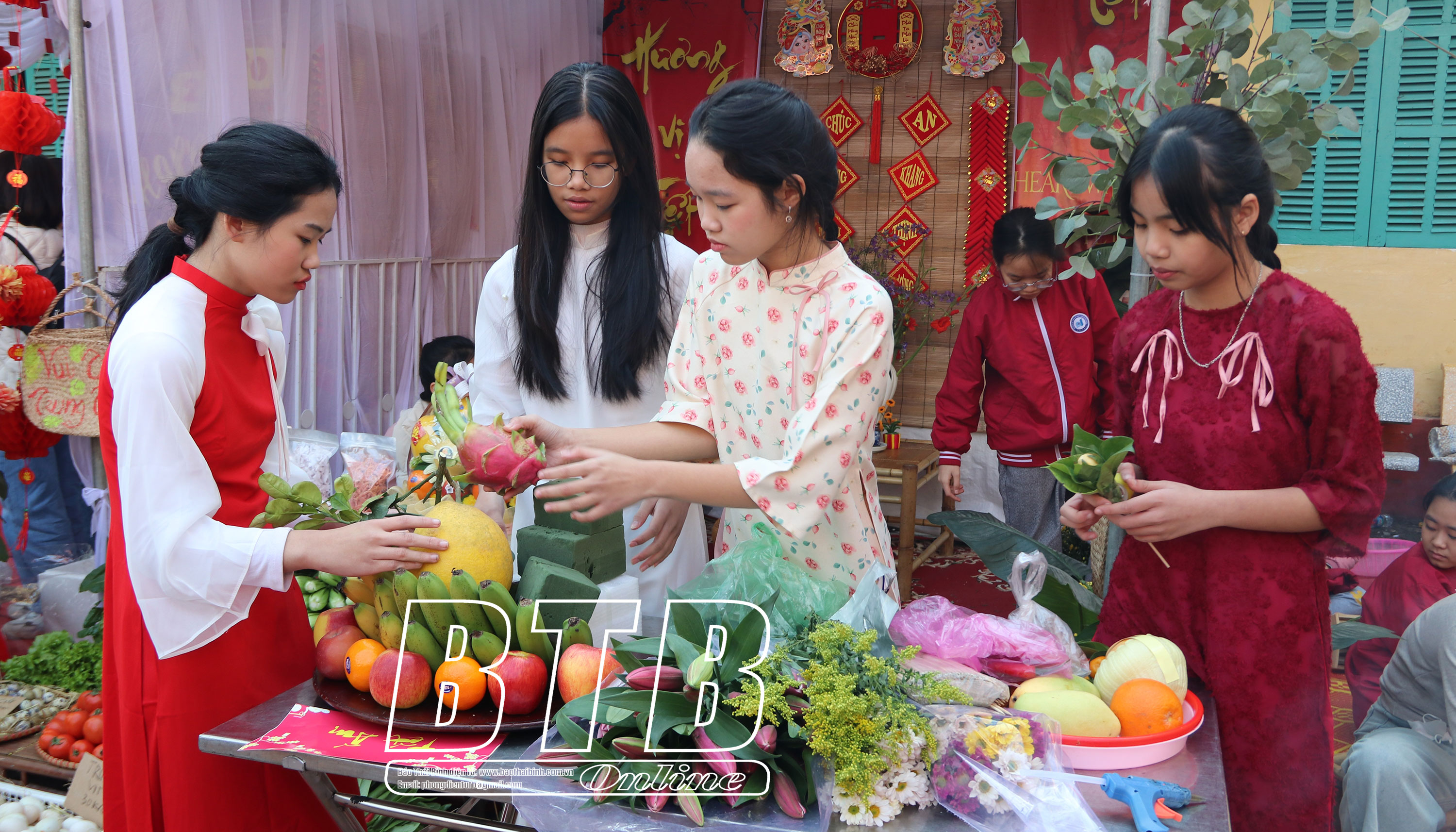 Tại hội chợ tết quê em và trò chơi dân gian chào xuân Ất Tỵ 2025 của Trường Tiểu học, THCS và THPT Quách Đình Bảo (thành phố Thái Bình), không khí tết len lỏi vào từng góc nhỏ trong khuôn viên nhà trường. Sân trường rực rỡ sắc đỏ của câu đối, sắc hồng của hoa đào cùng mùi thơm đặc trưng của bánh chưng, lá mùi già. Học sinh đã hòa mình vào các hoạt động: gói bánh chưng, bày mâm ngũ quả, viết thư pháp, giới thiệu về gian hàng và niềm nở chào bán các sản phẩm có trong gian hàng của lớp mình. Cùng với đó, các em đã tham gia nhiều trò chơi dân gian hấp dẫn, thú vị.