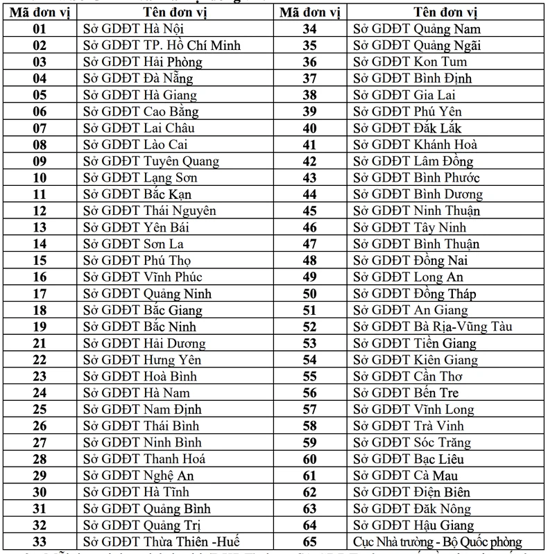 Mã Sở Giáo dục và Đào tạo, mã hội đồng thi năm 2025 do Bộ Giáo dục và Đào tạo quy định như sau:
