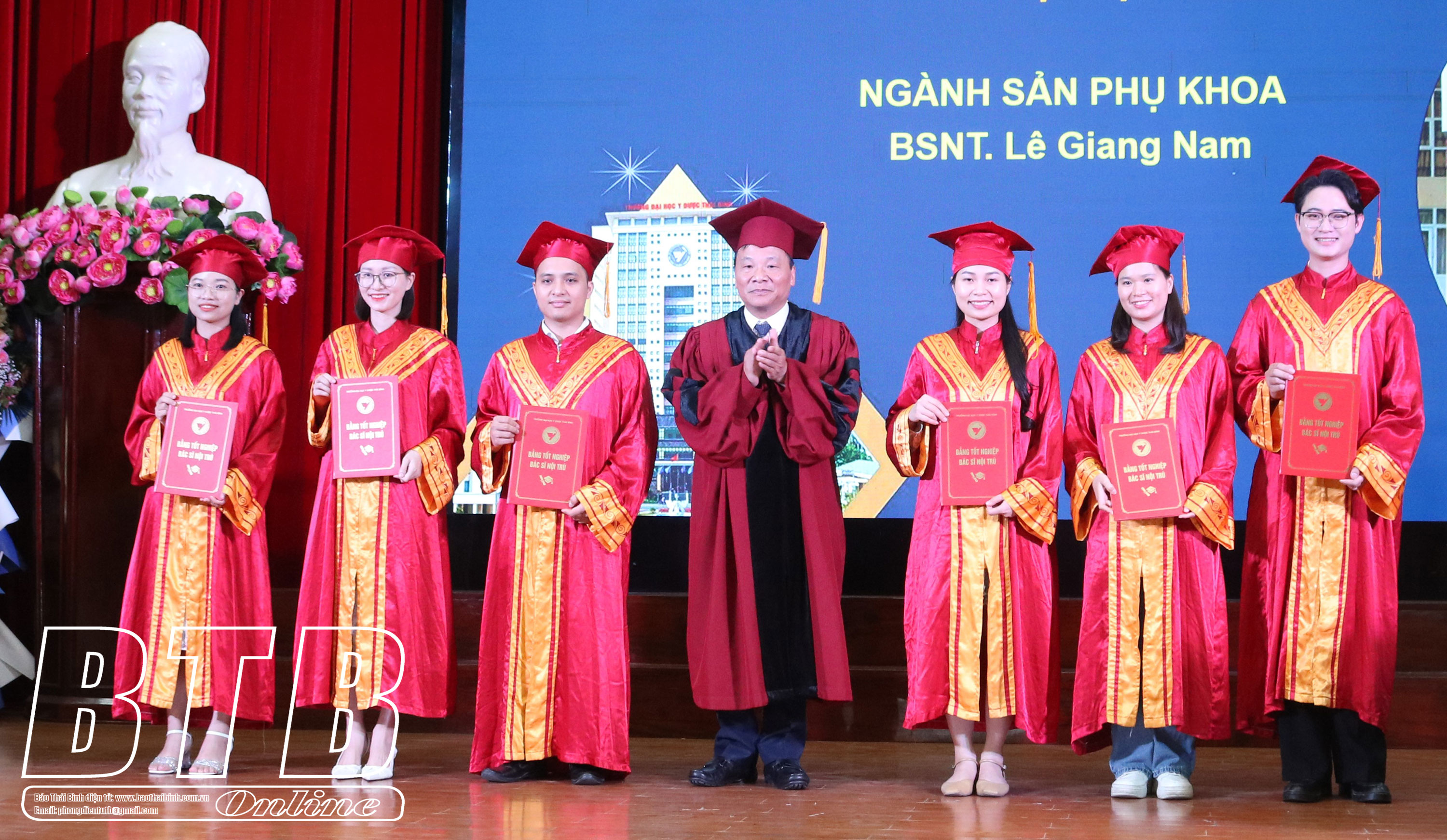 Hiệu trưởng Trường Đại học Y Dược Thái Bình trao bằng tốt nghiệp cho các bác sĩ nội trú.