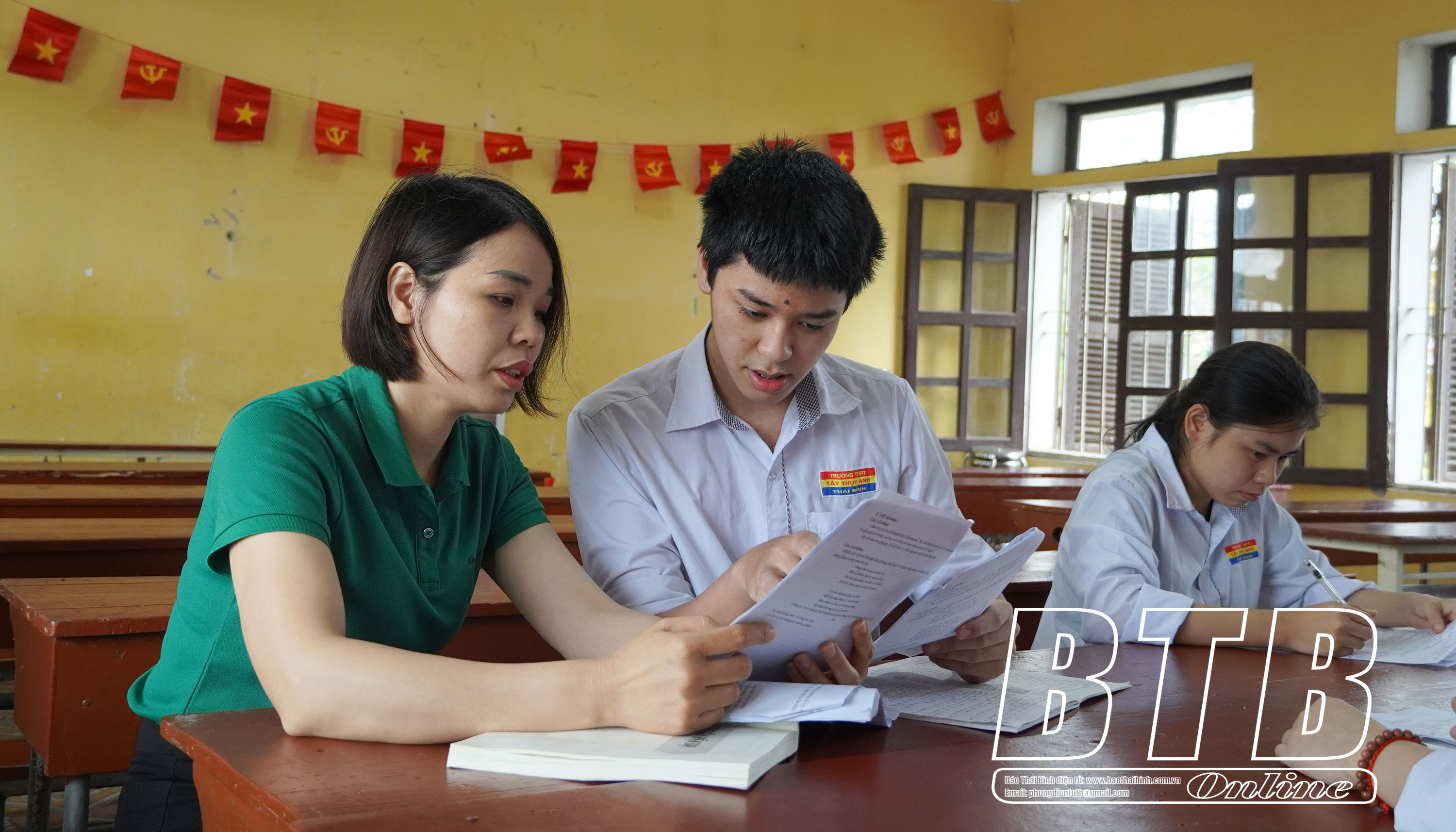 Em Phạm Hoàng Hải, học sinh lớp 12A8, Trường THPT Tây Thụy Anh, được cô giáo rèn luyện kỹ năng làm bài thi.