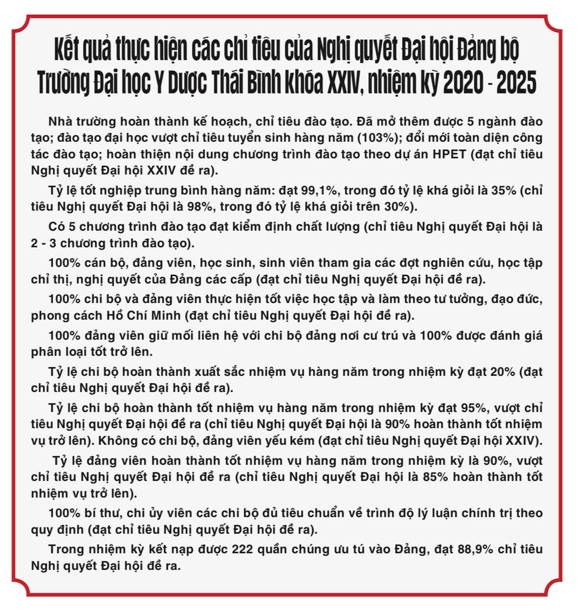 Với gần 700 đảng viên sinh hoạt tại 37 chi bộ, Đảng bộ Trường Đại học Y Dược Thái Bình là hạt nhân chính trị lãnh đạo toàn diện các hoạt động của nhà trường. Công tác phát triển Đảng, giáo dục lý tưởng cách mạng, tư tưởng chính trị, đạo đức nghề nghiệp được triển khai toàn diện, đạt những kết quả tích cực. Công tác đào tạo, bồi dưỡng cán bộ quản lý, giảng viên trẻ luôn được quan tâm. Đảng bộ nhà trường thực hiện quy hoạch cán bộ lâu dài, đầu tư cho các chương trình sau đại học, hợp tác đào tạo với các trường quốc tế uy tín và trung tâm đào tạo lớn ở trong nước.