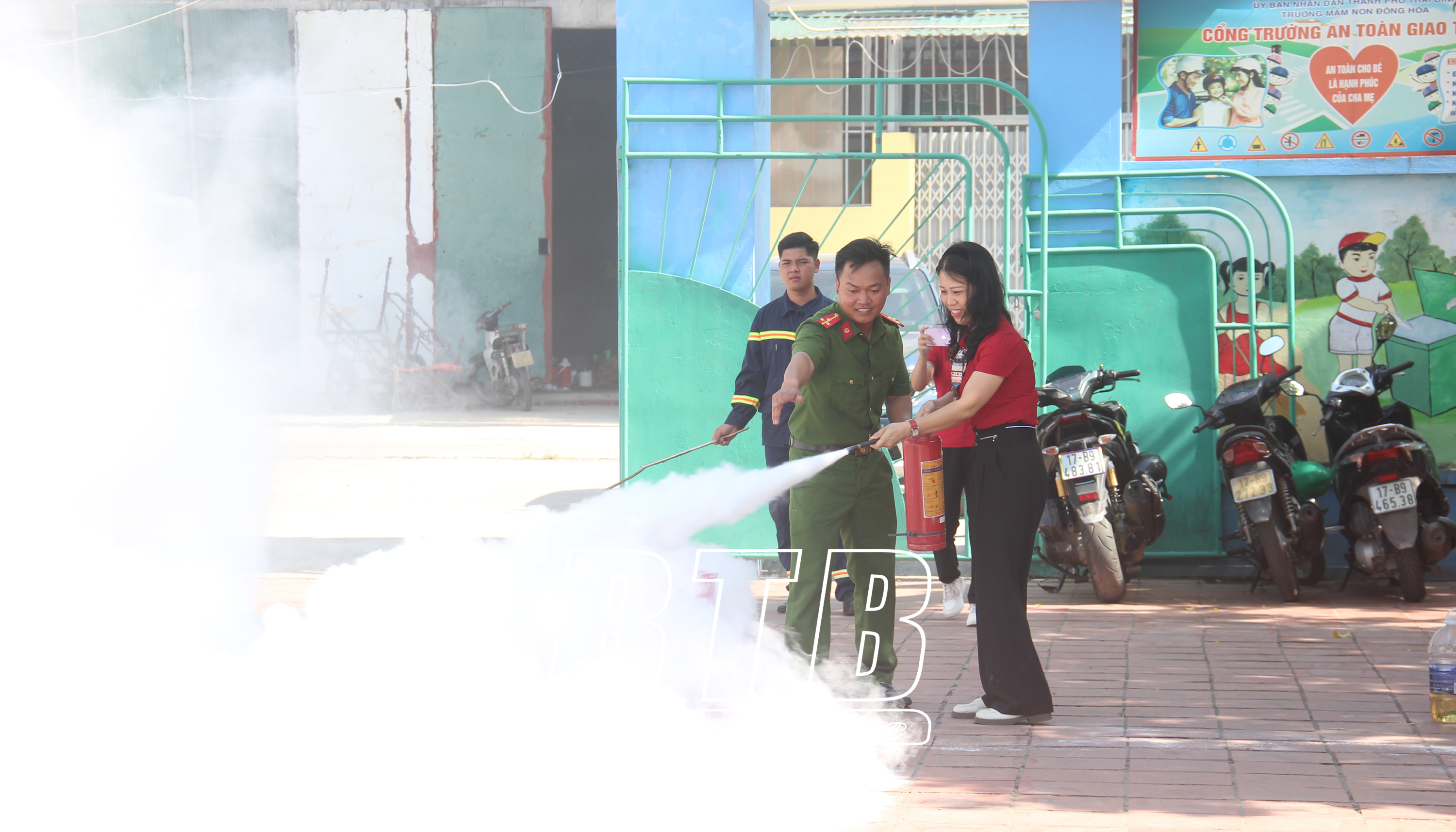 Cán bộ, giáo viên Trường Mầm non xã Đông Hòa thực hành dập lửa bằng bình chữa cháy xách tay.