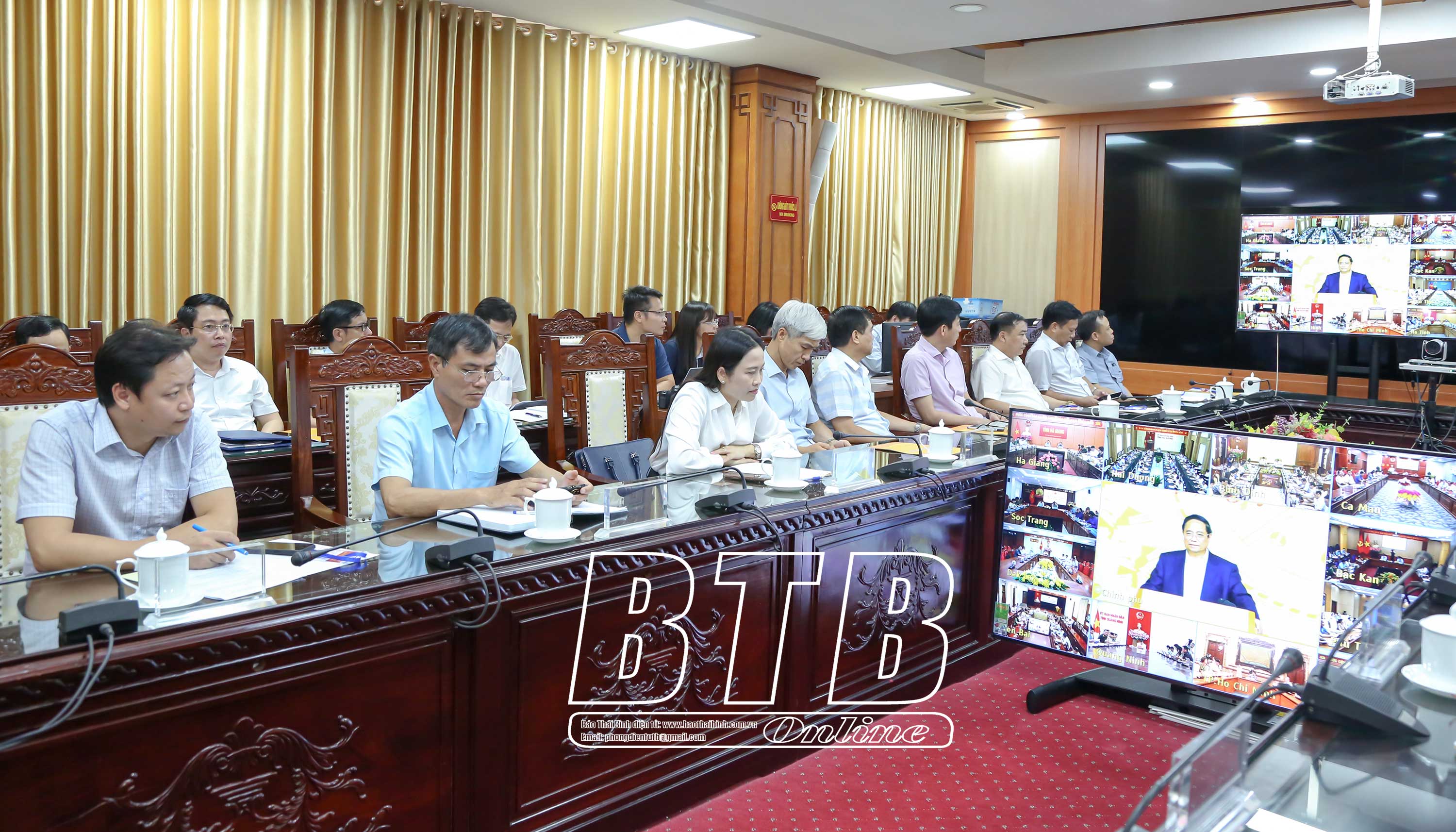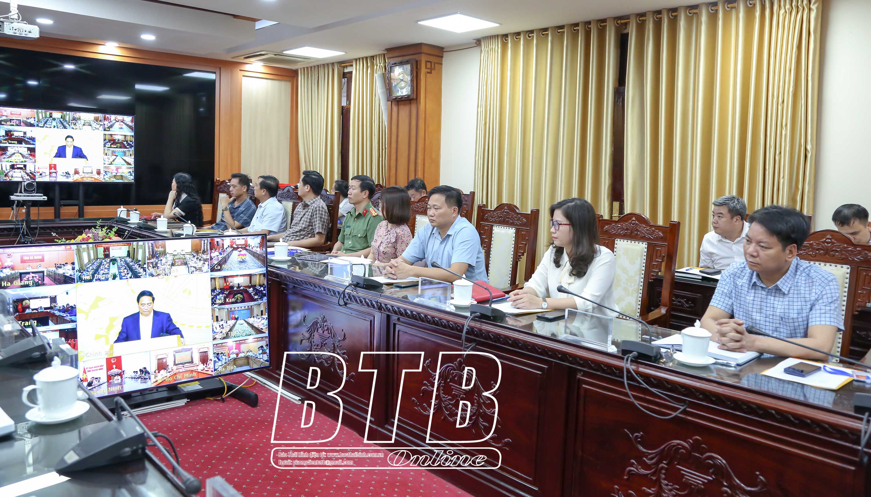 Đồng chí Nguyễn Khắc Thận, Bí thư Tỉnh ủy và các đồng chí lãnh đạo tỉnh dự hội nghị tại điểm cầu Thái Bình.