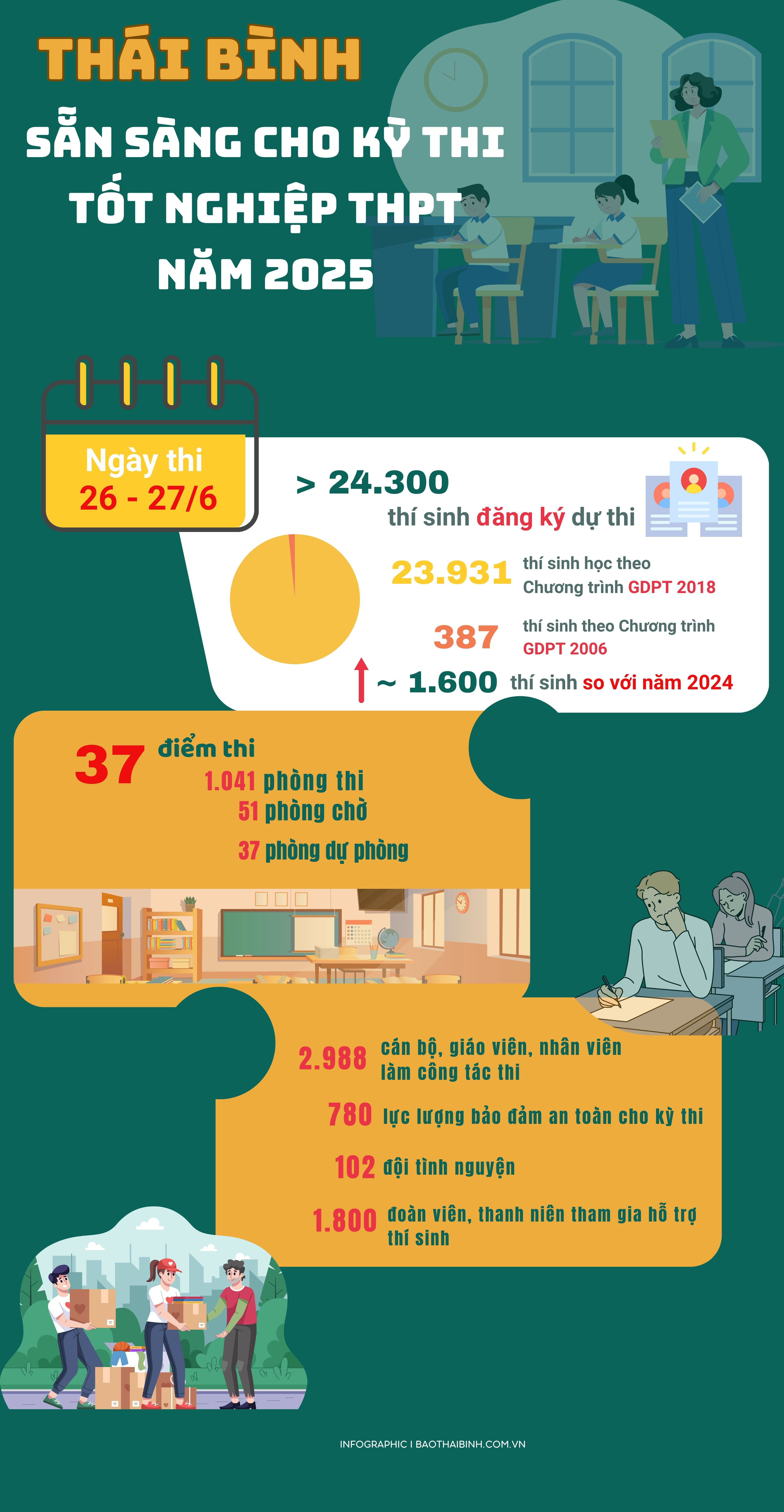 Kỳ thi tốt nghiệp THPT diễn ra từ ngày 26 đến 27/6, đến thời điểm này, tỉnh Thái Bình đã chủ động triển khai đồng bộ các phương án nhằm đảm bảo kỳ thi diễn ra an toàn, nghiêm túc, đúng quy chế. Từ cơ sở vật chất, nhân lực đến công tác hỗ trợ thí sinh đều được chuẩn bị kỹ lưỡng, sẵn sàng cho một kỳ thi hiệu quả và thành công.