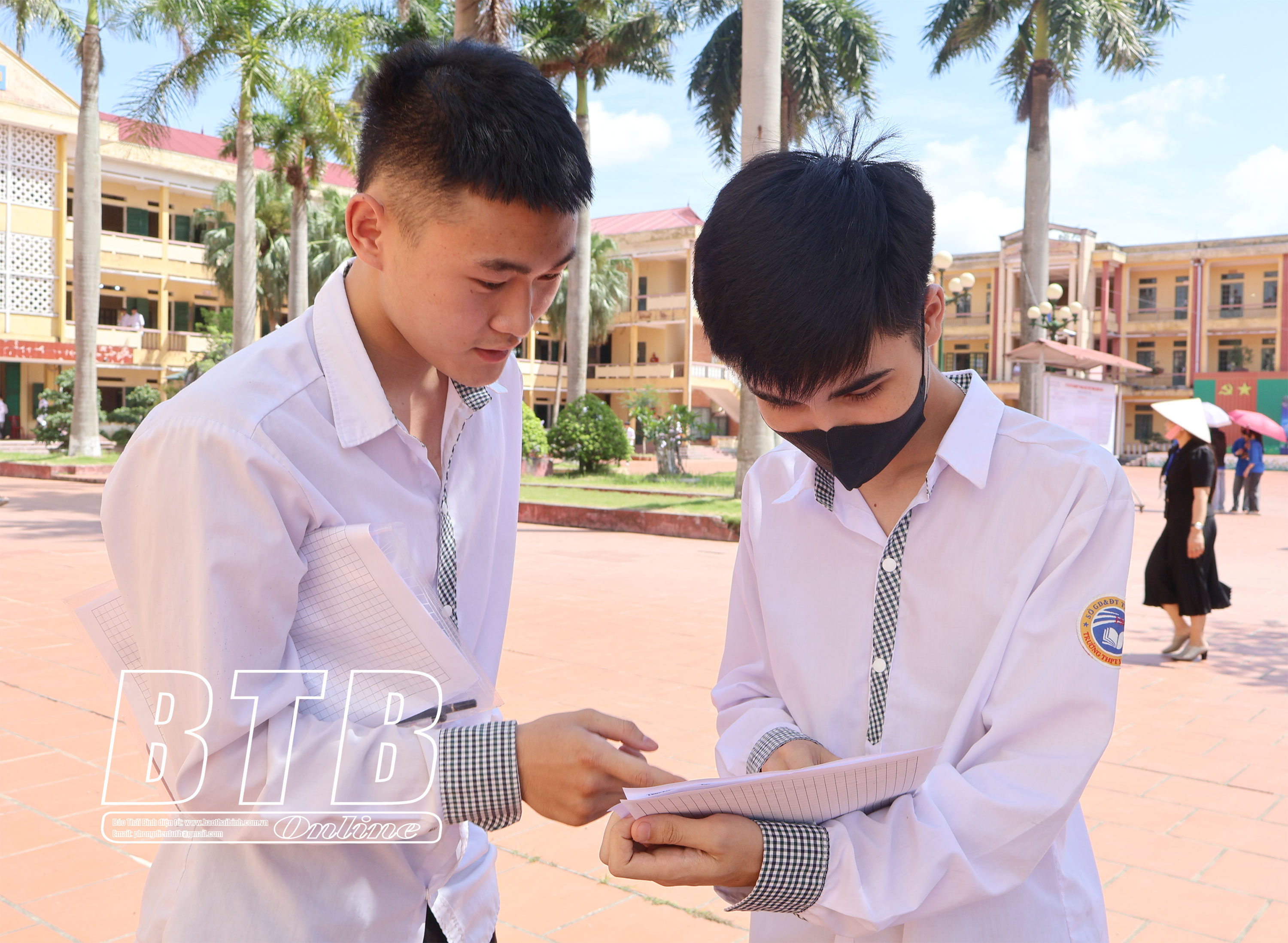 Thí sinh tại điểm thi Trường THPT Lý Bôn trao đổi về đề thi môn Ngữ văn.