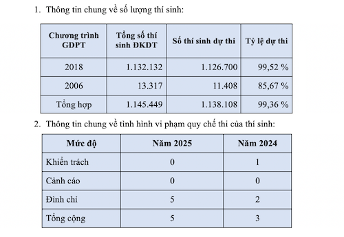 Trong buổi thi thứ 2 của Kỳ thi tốt nghiệp THPT năm 2025, ở môn Toán, có 1,14 triệu thí sinh dự thi, đạt tỷ lệ có mặt 99,4%. Trong buổi thi này, đã có 5 thí sinh bị đình chỉ do vi phạm quy chế thi.