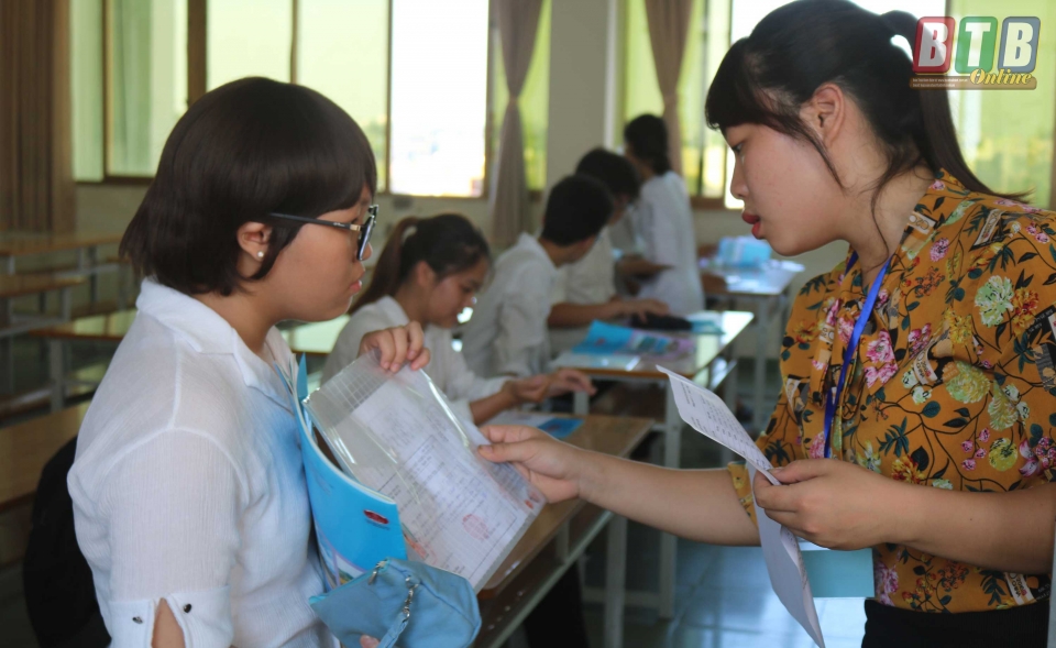 Giám thị kiểm tra thẻ dự thi của thí sinh khi vào phòng thi.