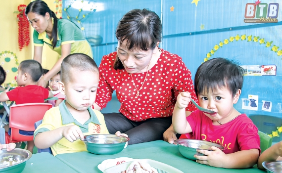 Giờ ăn trưa của các cháu Trường Mầm non Quỳnh Lâm.
