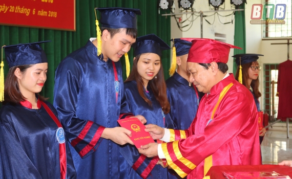 Thầy giáo Bùi Trọng Trâm, Hiệu trưởng Trường Cao đẳng Sư phạm Thái Bình trao bằng tốt nghiệp cho sinh viên đạt loại giỏi.