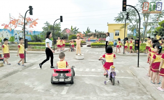 Giờ học về an toàn giao thông của các cháu Trường Mầm non Tam Quang (Vũ Thư).