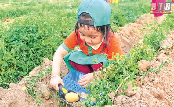 Trường Mầm non tư thục Hoa Phượng (thành phố Thái Bình) tổ chức cho các cháu trải nghiệm thực tế thu hoạch khoai tây.