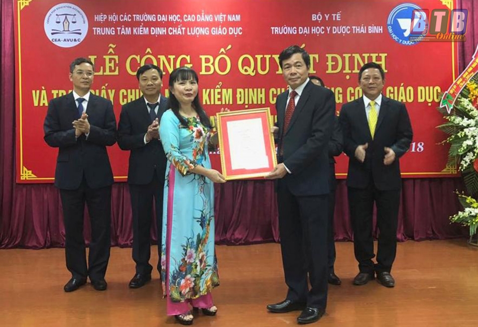 Tại buổi lễ, PGS.TS Nguyễn Phương Nga, Giám đốc Trung tâm kiểm định chất lượng giáo dục chúc mừng Trường Đại học Y Dược Thái Bình là 1 trong 9 trường đại học khối khoa học sức khỏe của cả nước được công nhận đạt chuẩn và nhận giấy chứng nhận kiểm định chất lượng cơ sở giáo dục. Đồng thời đánh giá cao nỗ lực của Trường Đại học Y Dược Thái Bình trong việc đào tạo nhân lực y tế, góp phần chăm sóc, bảo vệ, nâng cao sức khoẻ nhân dân Việt Nam cũng như 2 nước bạn Lào, Campuchia. Việc được cấp giấy chứng nhận góp phần khẳng định truyền thống và những thành tựu của Trường Đại học Y Dược Thái Bình đã được xã hội ghi nhận.