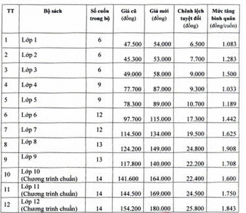 Với phương án đã được phê duyệt và hoàn tất thủ tục đăng ký giá với Bộ Tài chính (Cục Quản lý giá), giá bán các bộ SGK từ lớp 1 đến lớp 12 sẽ được điều chỉnh như sau: